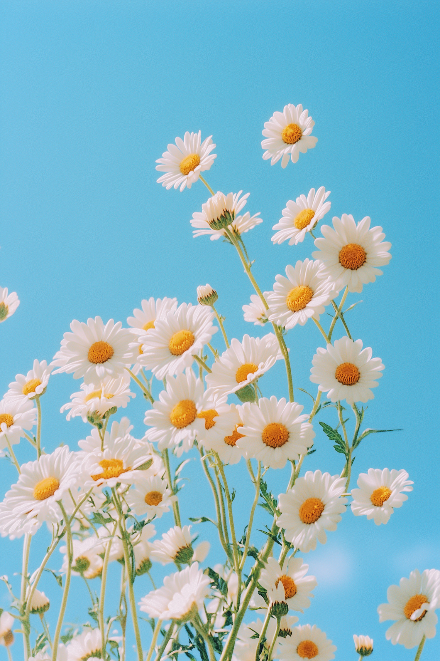 Bright white daisies with yellow centers bloom against a vivid blue sky, creating a cheerful and serene natural scene.