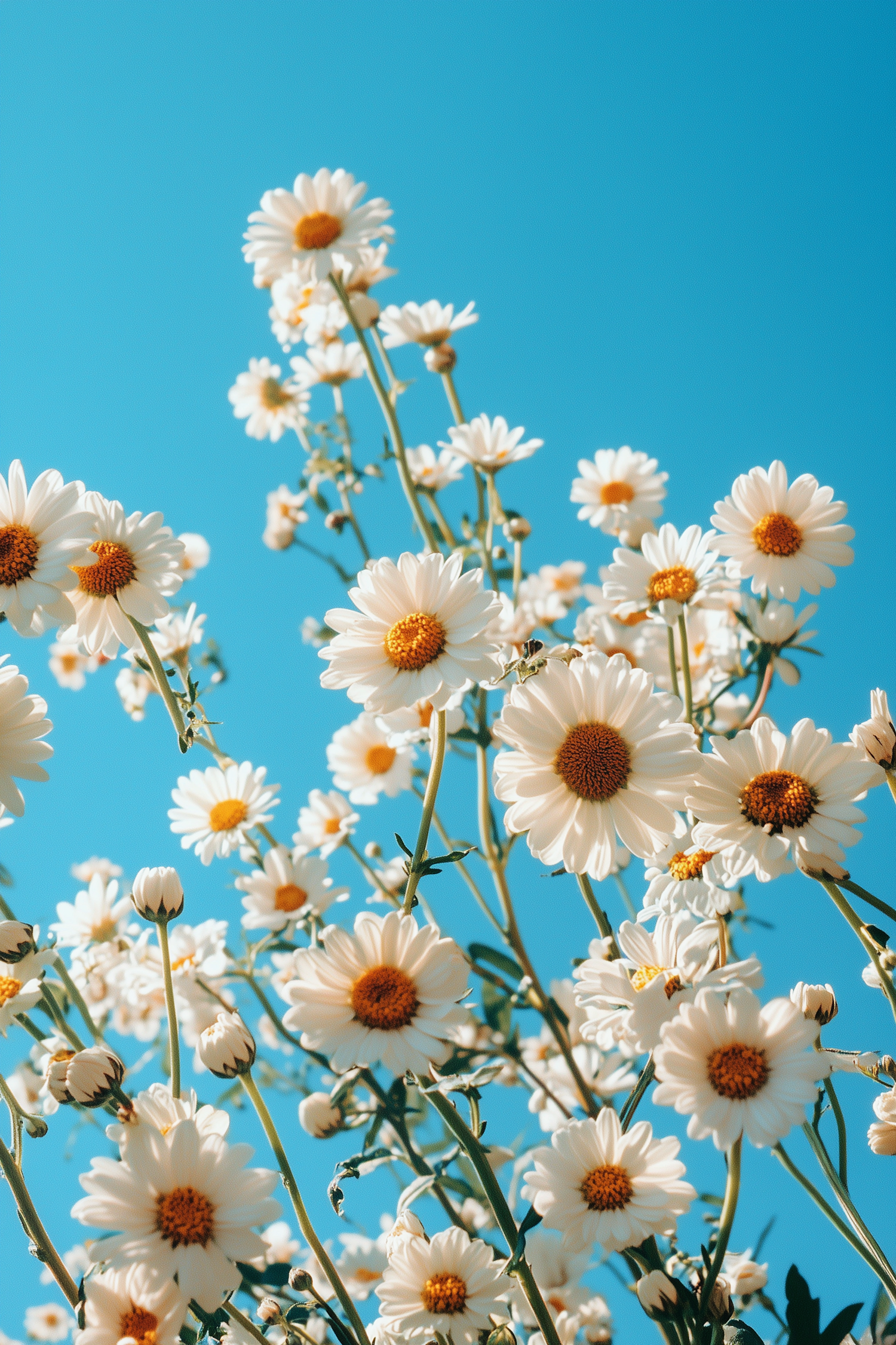 Bright white daisies with yellow centers bloom against a vivid blue sky, creating a cheerful and vibrant floral scene.