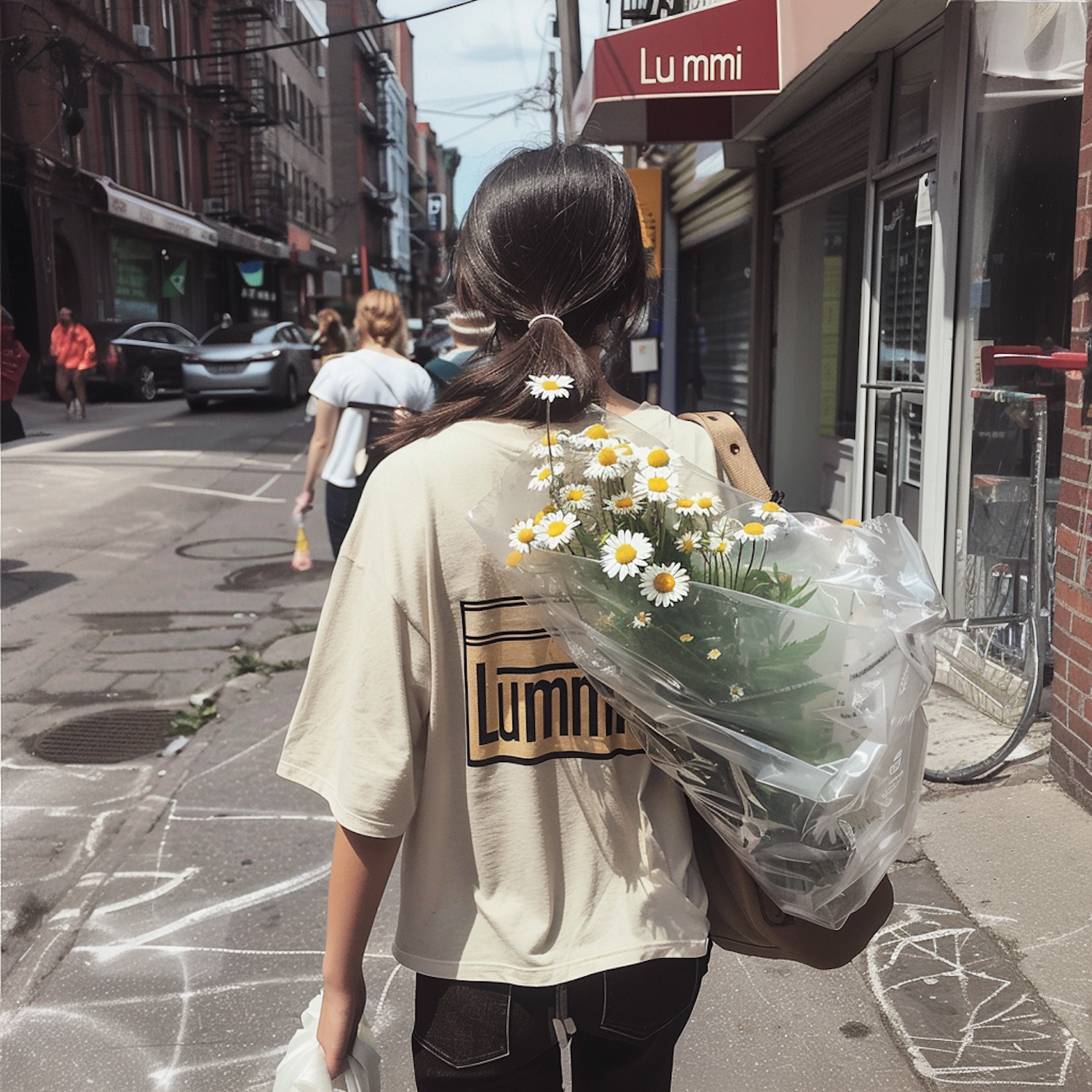 Woman with daisies walks down a sunny city street, wearing a 'Lummi' T-shirt. Urban scene with shops and pedestrians.