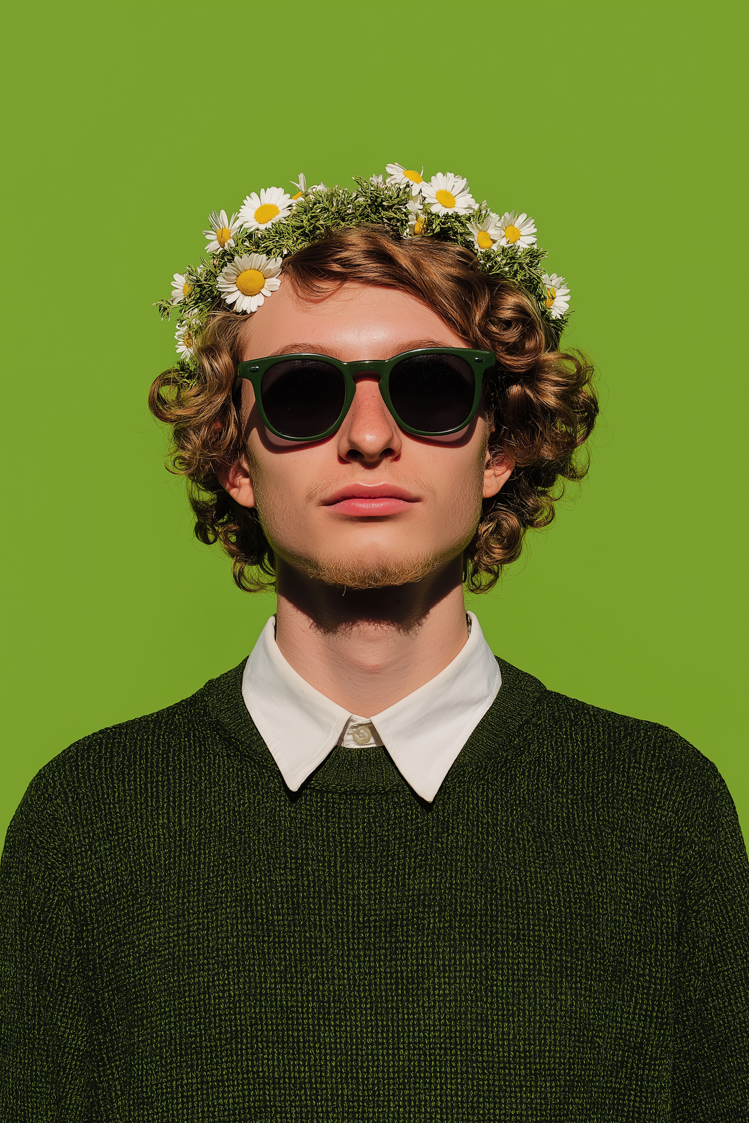 A person with curly hair, a daisy crown, and green sunglasses against a bright green background, exuding a fresh and natural vibe.