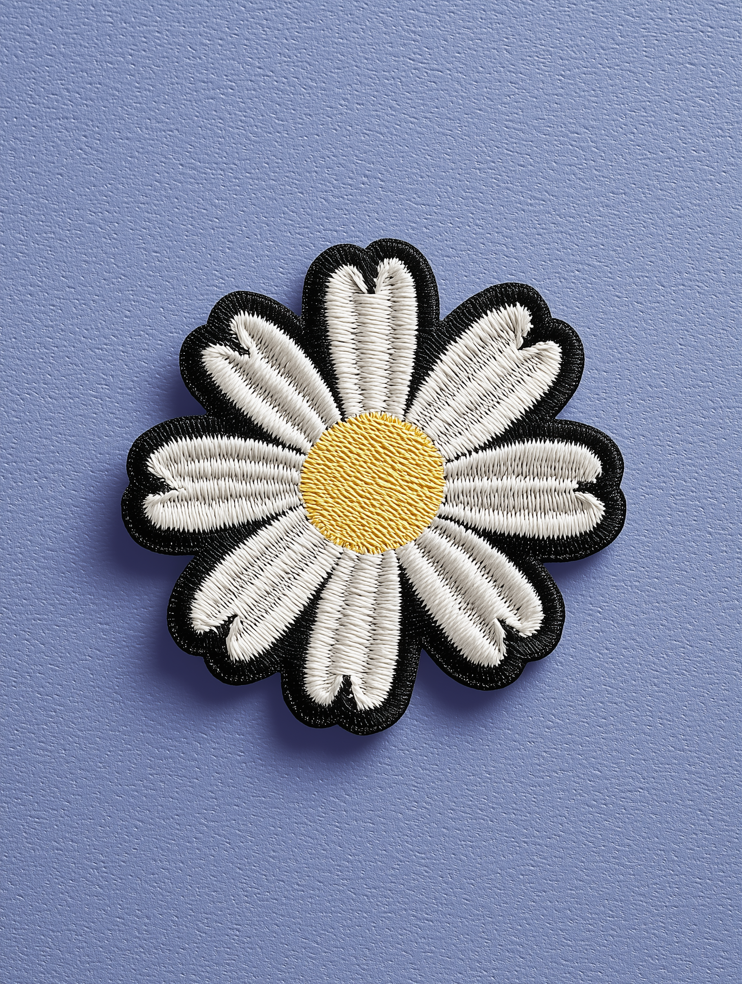 A detailed embroidered daisy patch with white petals, a yellow center, and a black outline on a textured light blue background.