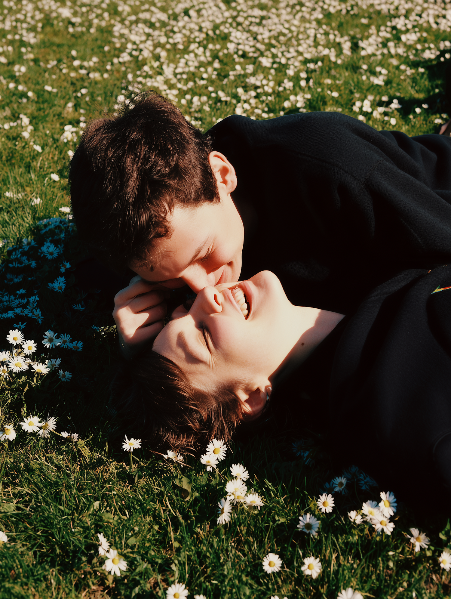 Two individuals lying in a meadow with daisies, joyfully smiling and sharing a warm, affectionate moment against a serene backdrop.