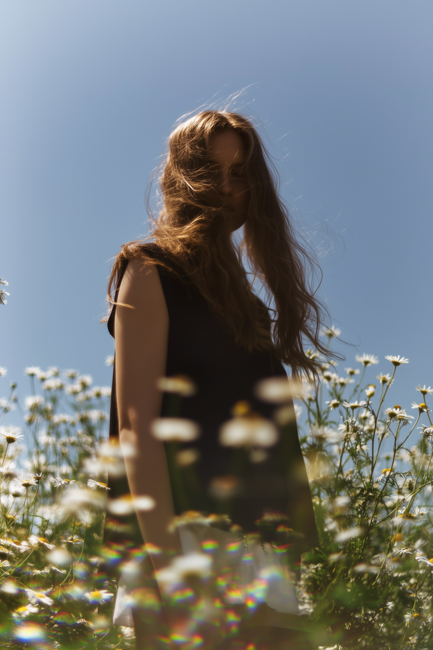 A person stands in a field of white daisies under a clear blue sky, with warm sunlight creating a dreamy, lens-flared effect.