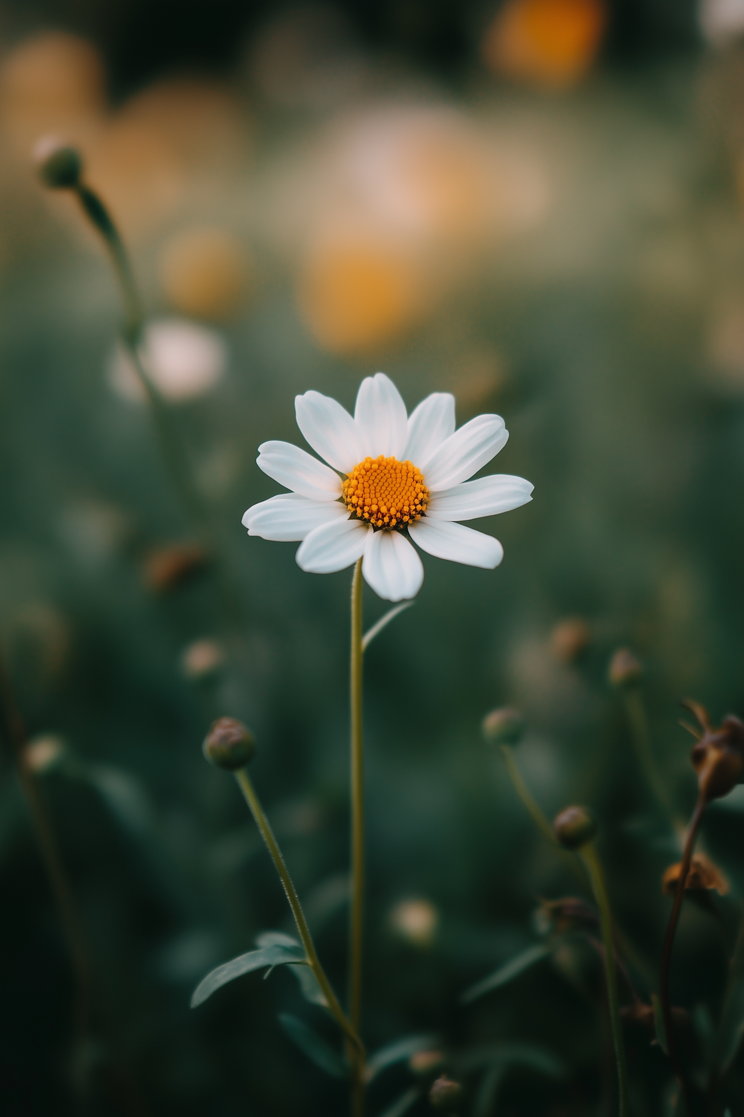 Close-up of a daisy with white petals and a yellow center against a blurred green background, creating a serene and dreamy atmosphere.