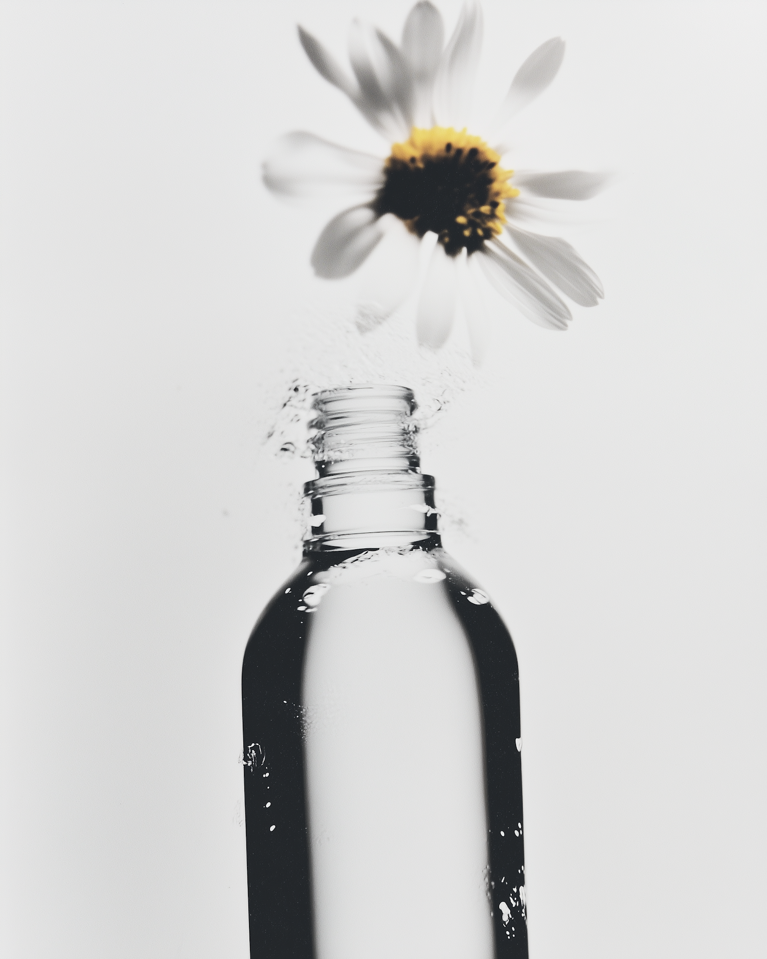 Minimalist shot of a clear glass bottle with water and a floating daisy above, set against a clean white background.