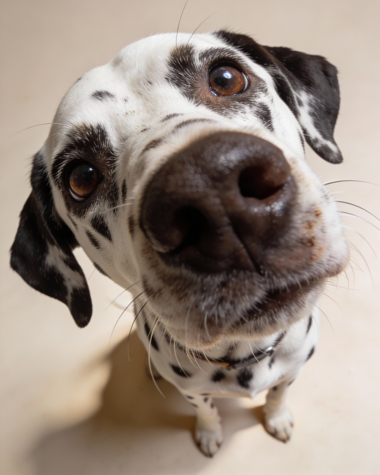 Ultra realistic studio pet photography, cold beige seamless background, clean minimal composition, soft diffused studio lighting, subtle natural shadows under the dog, high detail fur texture, visible whiskers, realistic nose texture, natural imperfections, sharp focus on eyes, high-end commercial photography, 85mm lens look, f/4 depth of field, crisp details, no text, no logo, no collar unless specified, no props unless specified, Close-up headshot, wide angle lens (slight fisheye distortion), dog leaning toward the camera with curious expression, nose very close to lens, head slightly tilted, ears relaxed, big shiny eyes looking directly at camera, breed: Dalmatian, centered composition