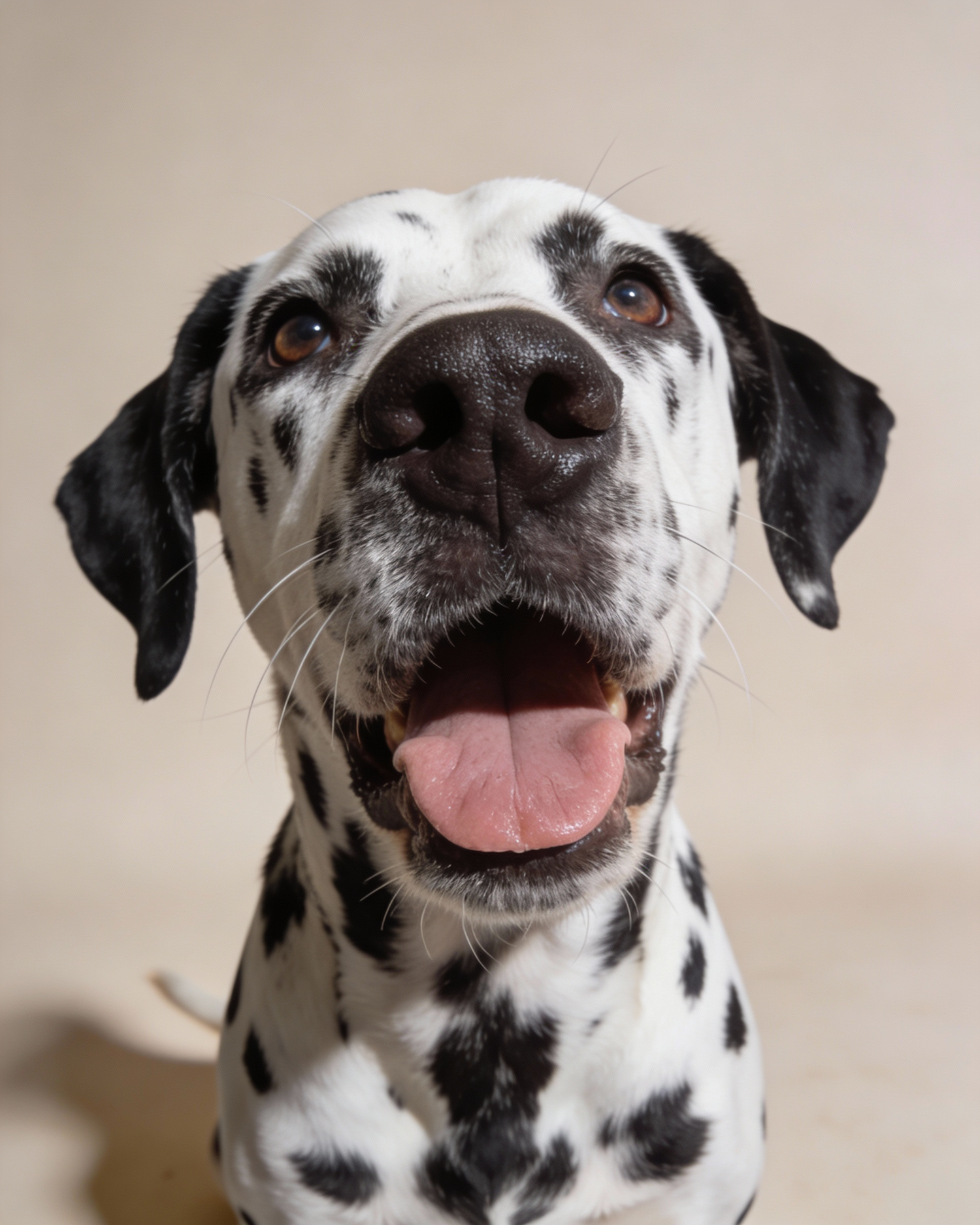 Ultra realistic studio pet photography, cold beige seamless background, clean minimal composition, soft diffused studio lighting, subtle natural shadows under the dog, high detail fur texture, visible whiskers, realistic nose texture, sharp focus on eyes, high-end commercial photography, 85mm lens look, f/4 depth of field, crisp details, no text, no logo, no collar, no props, Close-up headshot from slightly below angle, dog looking upward, tongue out wide and drooping, ears flopping, funny candid expression, breed: Great Dane (harlequin black and white), strong face detail, nose texture highly realistic
