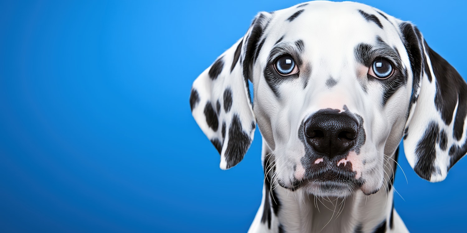 Close-up of a Dalmatian with blue eyes and black spots against a vibrant blue background, showcasing its calm and curious expression.