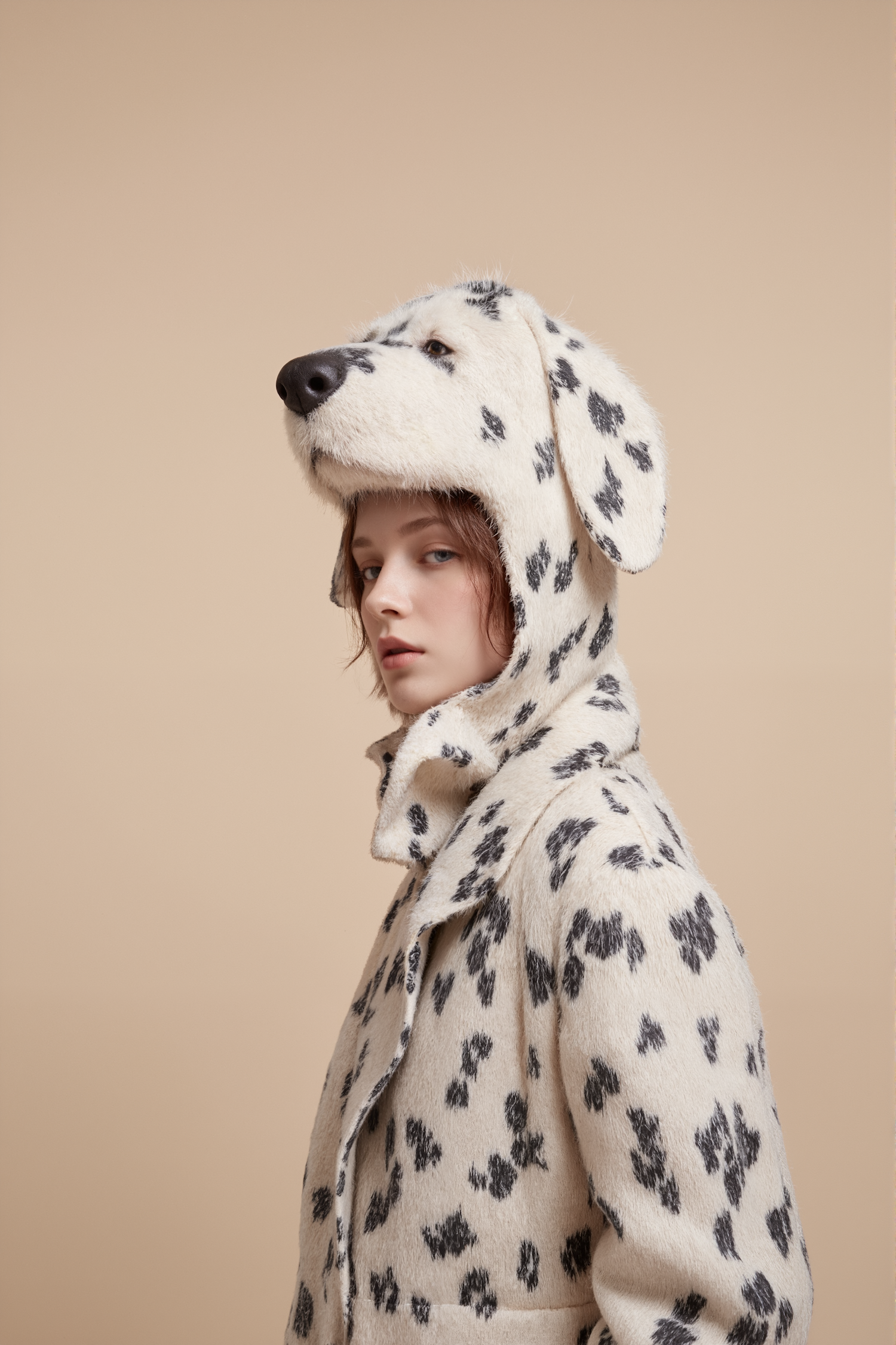 A woman in a Dalmatian-inspired coat with a dog-shaped hood, set against a beige background. Unique and creative fashion statement.