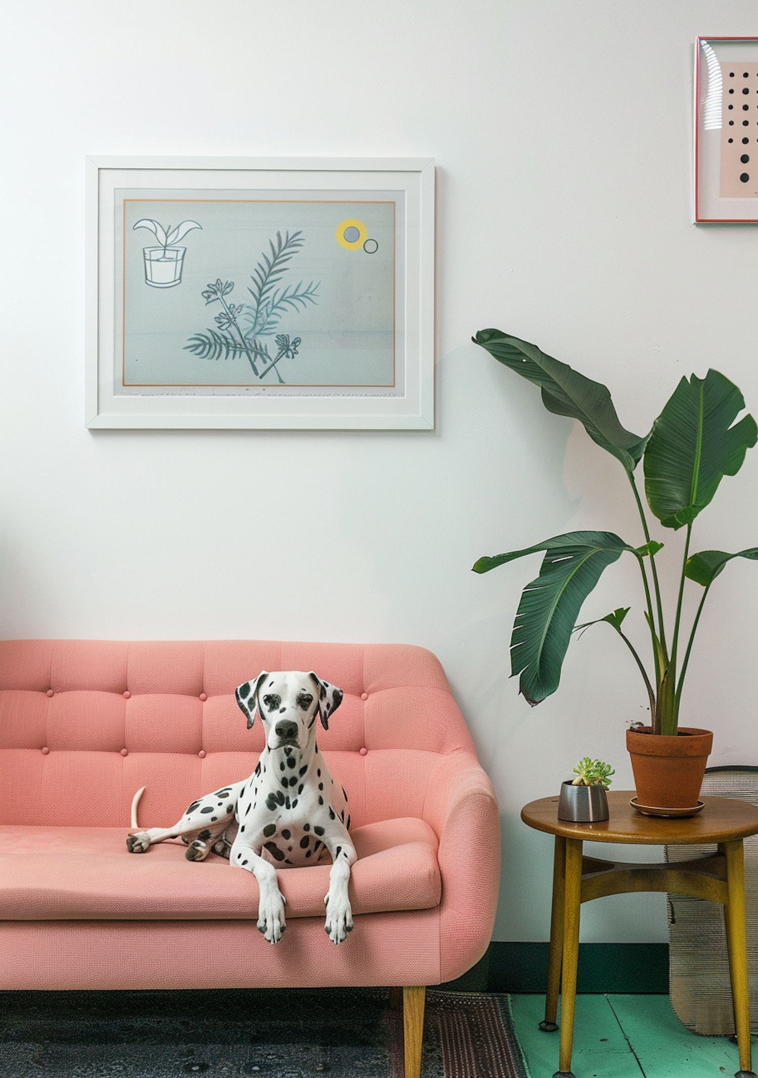 Dalmatian on a pink sofa with botanical art and a large plant, creating a cozy and stylish living room scene.