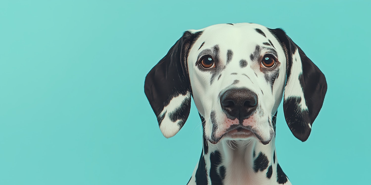Dalmatian dog with black spots against a turquoise background, showcasing its expressive eyes and unique coat pattern.