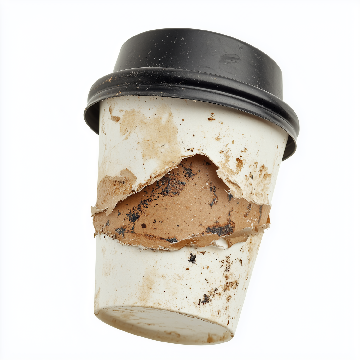 A torn and dirty disposable coffee cup with a black lid, showing its deteriorated state against a plain white background.