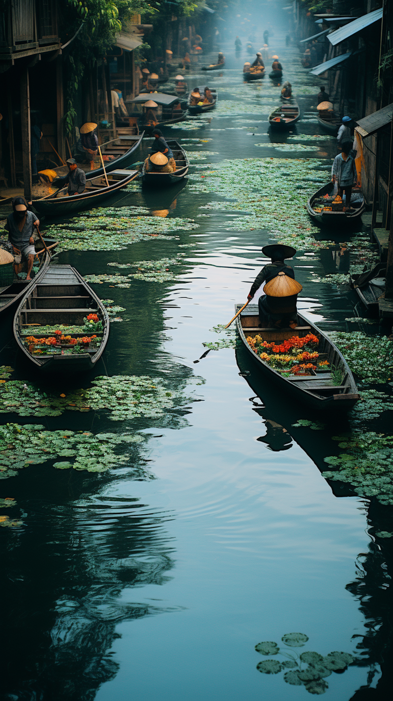 Traditional boats on a misty canal with vibrant produce and lily pads, creating a serene market scene.
