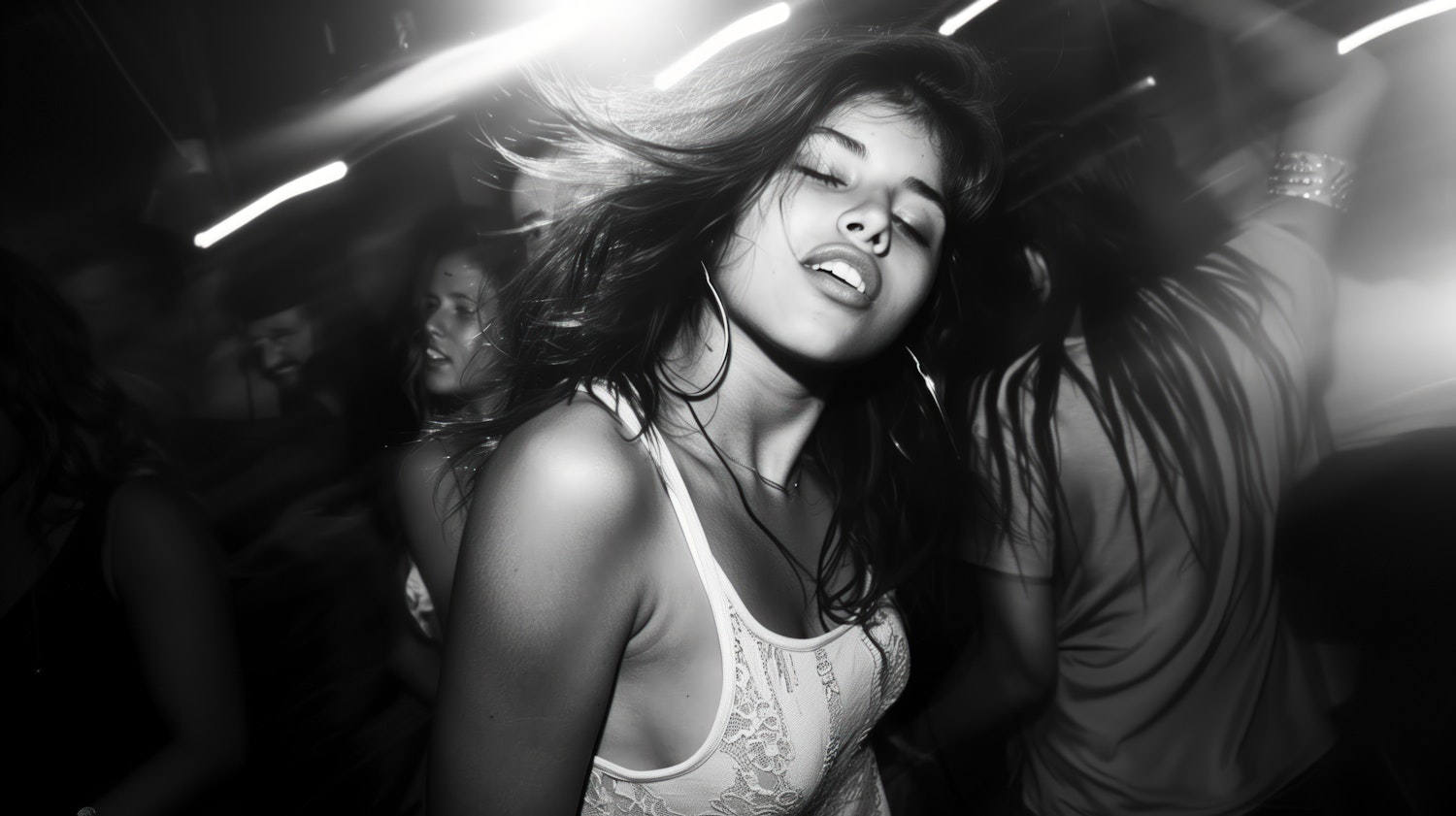 Energetic dance scene with a young woman in a club, eyes closed, enjoying the music. Blurred background and bright lights enhance the lively vibe.
