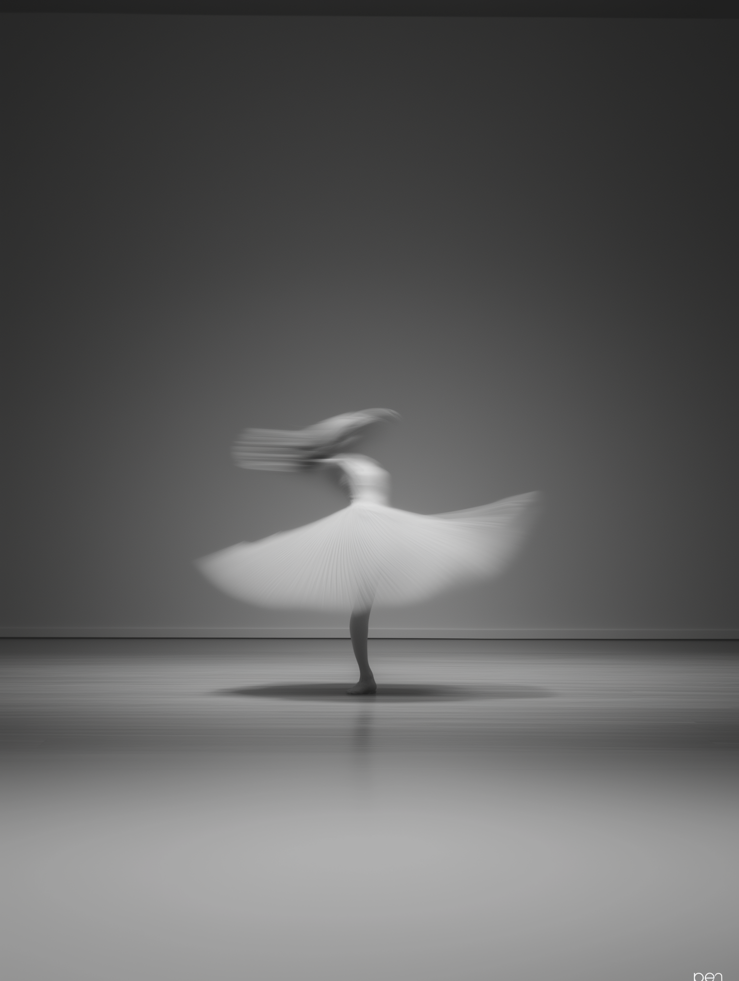 Blurred image of a dancer spinning in a white dress, creating a swirl effect against a soft gray background.