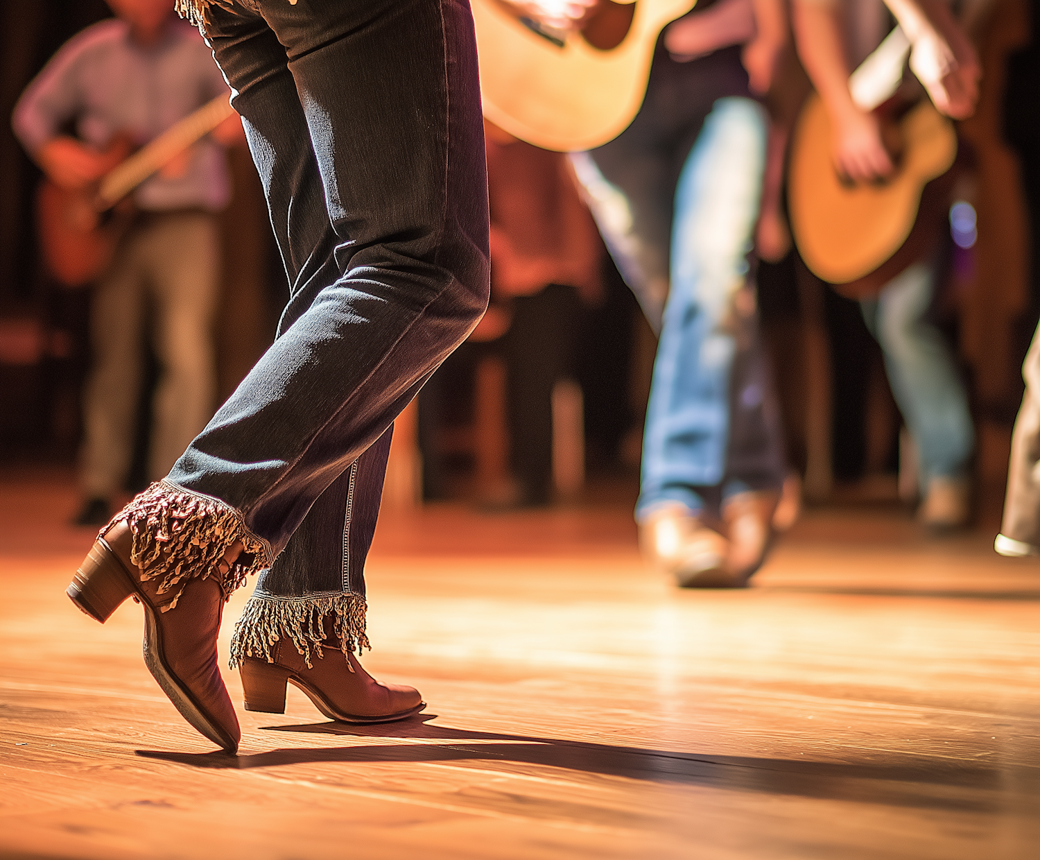Dynamic dance scene with fringed jeans and boots, blurred guitarists in the background, warm lighting on a wooden floor.