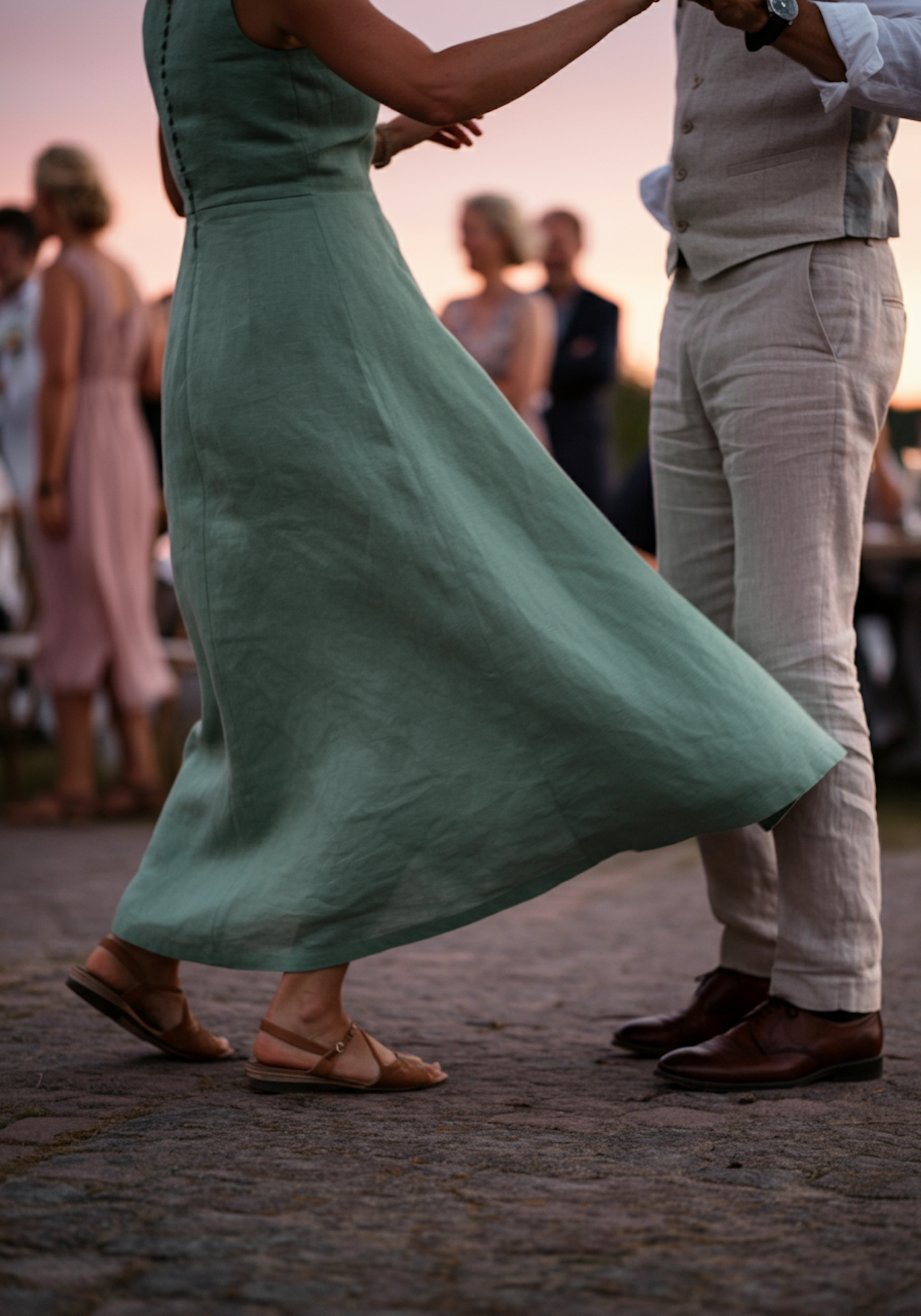 A couple dances outdoors at sunset, the woman in a green dress and sandals, the man in beige attire, with a blurred festive background.