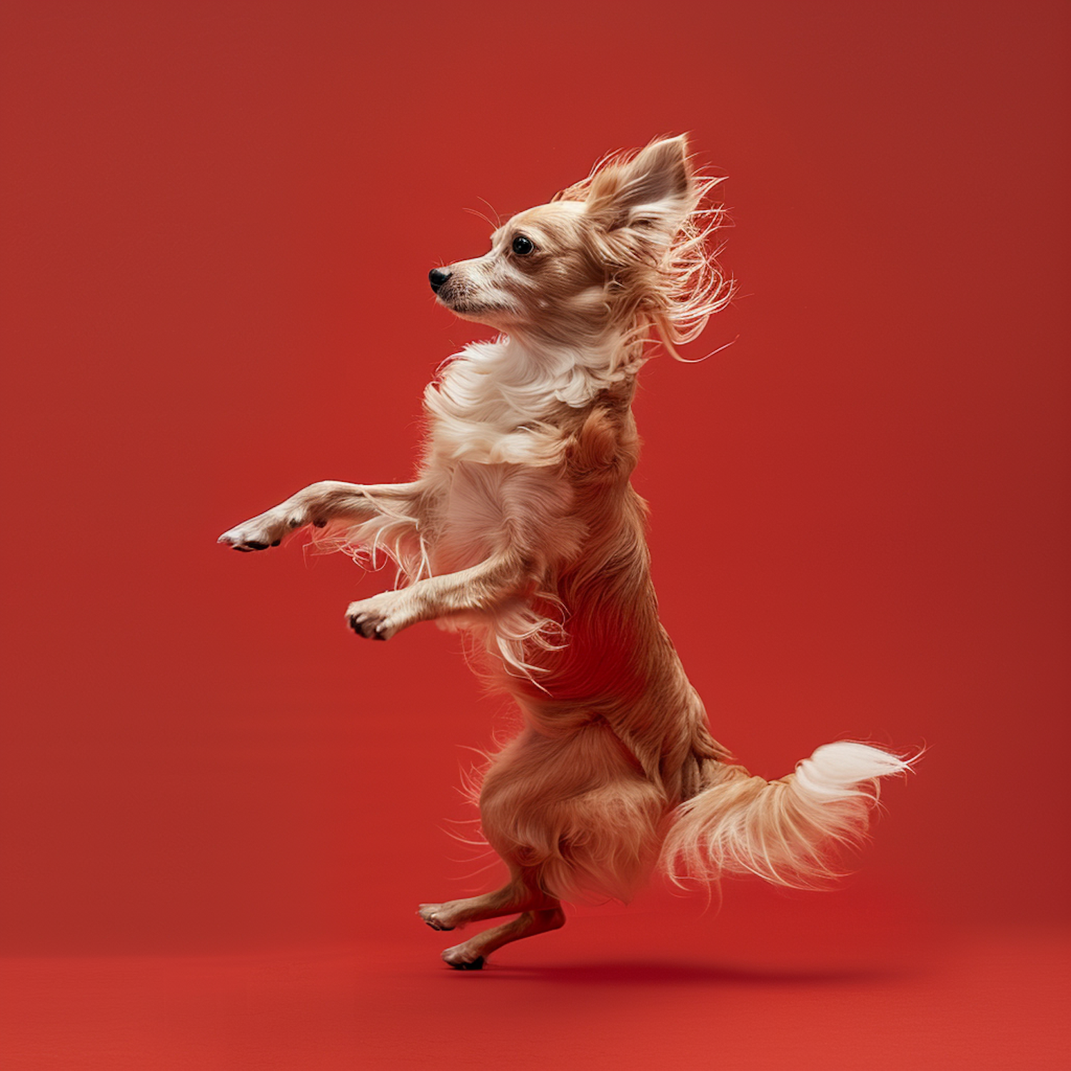 Energetic small dog with flowing fur jumps against a vibrant red background, showcasing agility and playfulness.