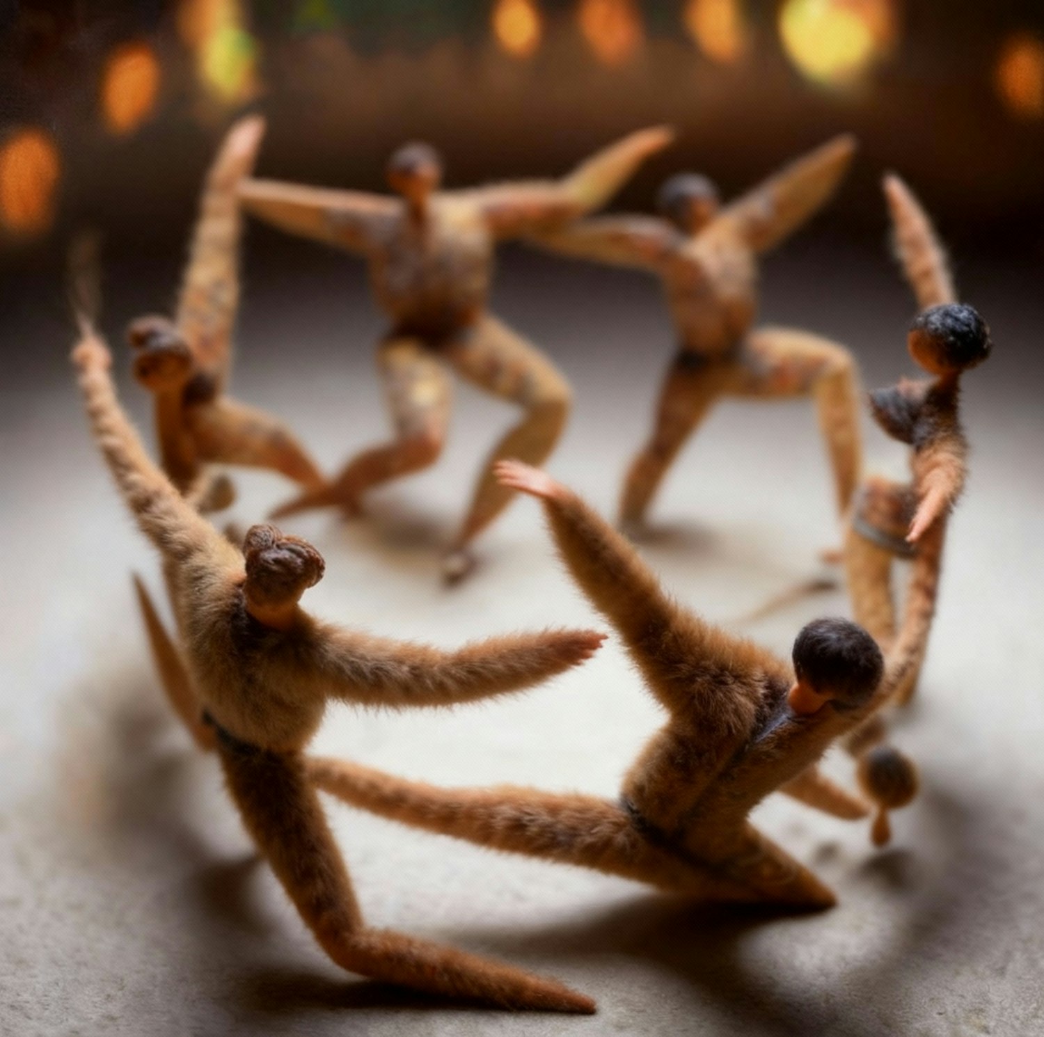 A group of fur-textured humanoid figurines in dynamic poses, arranged in a circle with a warm, glowing background.