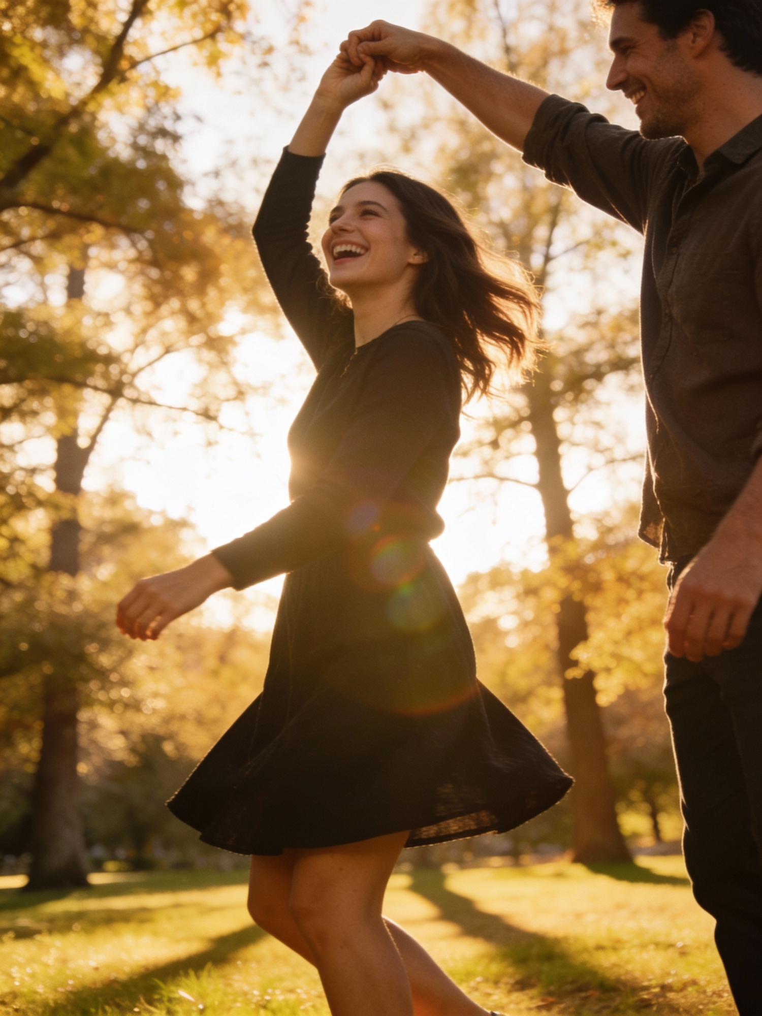 Ultra-realistic cinematic lifestyle photo, vertical 4:5. Golden hour outdoors in a park clearing. Low-angle medium shot: man gently spins the woman by the hand, both laughing; keep subjects sharp with minimal motion blur. Faces may be partially visible but candid. Warm glow, long shadows, subtle flare, creamy bokeh. 35mm look, shallow DOF, premium editorial retouch, subtle film grain. Negative prompt: logos, readable text, watermark, brand labels, staged posing, cheesy props, heart confetti, HDR, oversaturation, plastic-looking skin, over-smoothing, fake skin texture, overly perfect faces, deformed hands, extra fingers, distorted anatomy, unnatural body proportions, exaggerated facial expressions, forced smiles, harsh flash, heavy vignetting, excessive lens flare, motion blur on subjects, unrealistic lighting, over-sharpening halos, noise artifacts, banding.