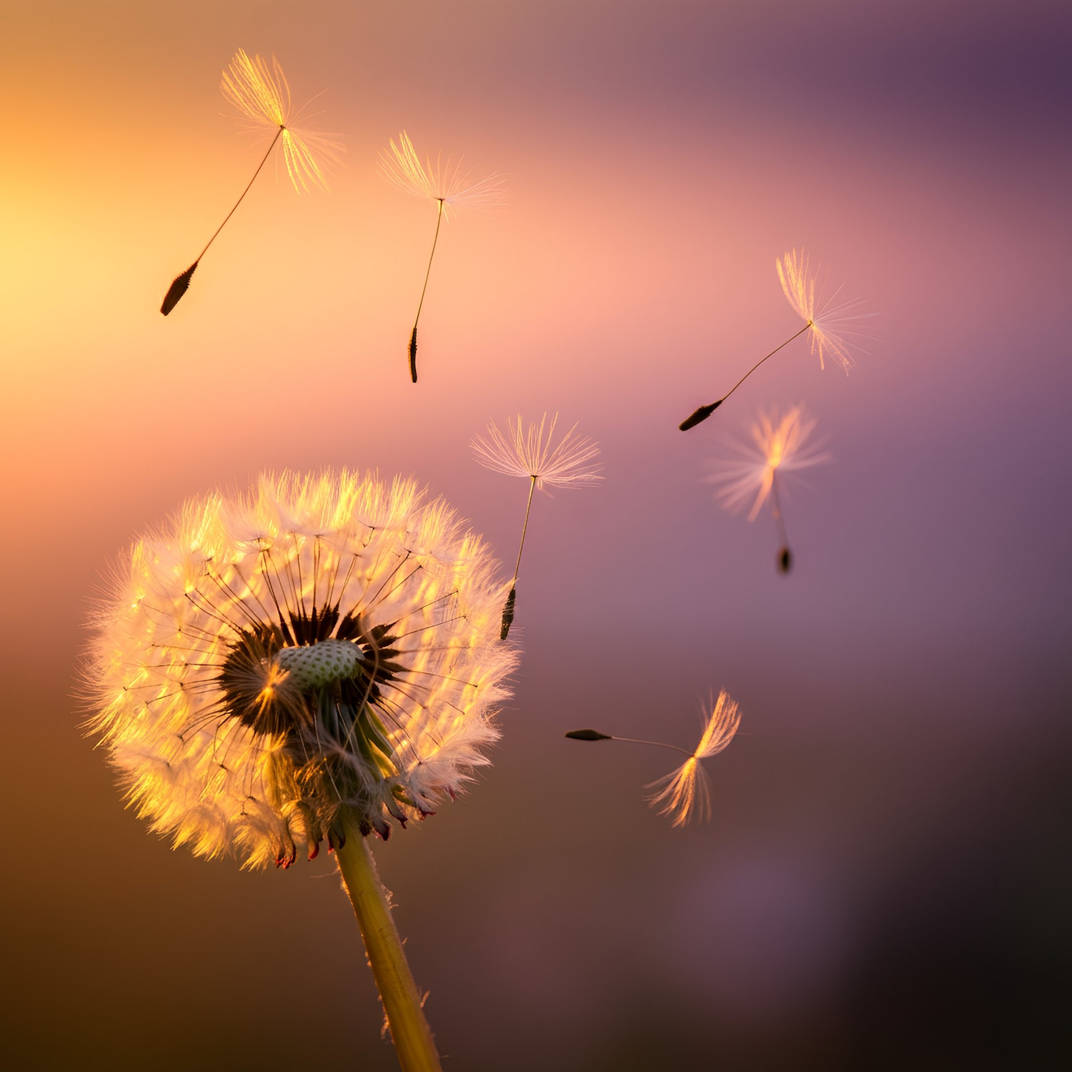 A dandelion releasing its seeds against a vibrant sunset gradient of orange and purple hues, symbolizing freedom and nature's beauty.
