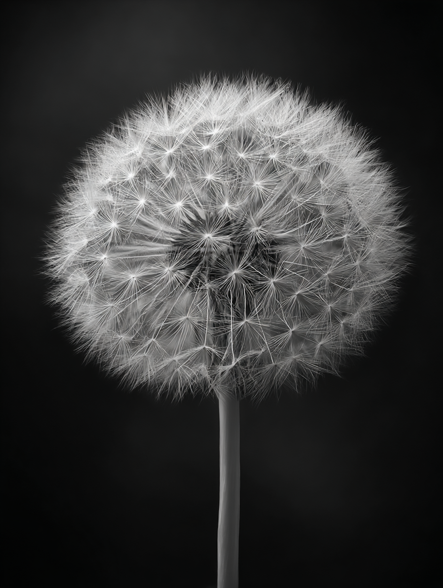 A stunning black-and-white close-up of a dandelion seed head, showcasing its intricate details against a dark background.