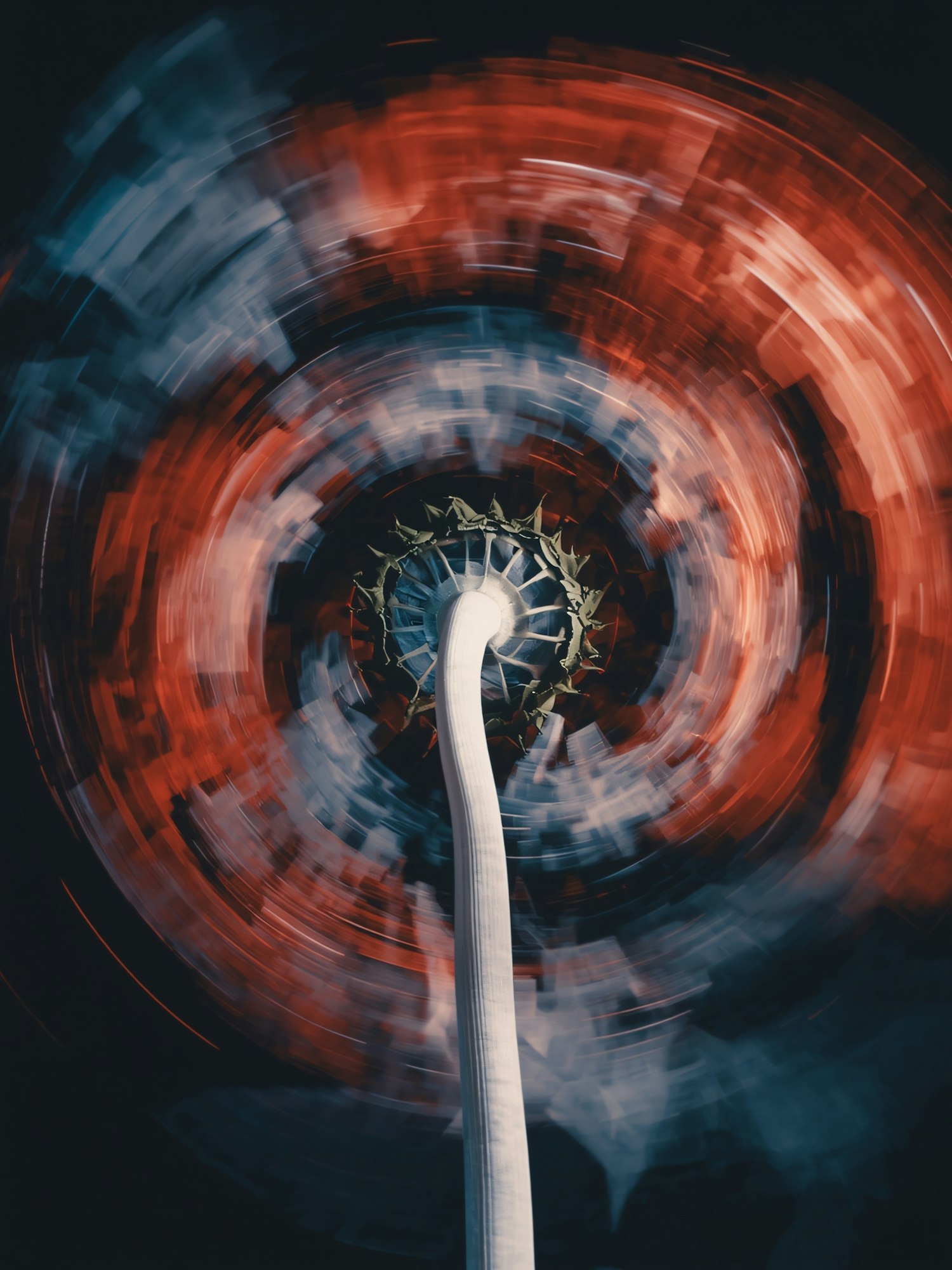 A dynamic close-up of a dandelion seed head with a swirling red and blue background, creating a vibrant and energetic visual effect.