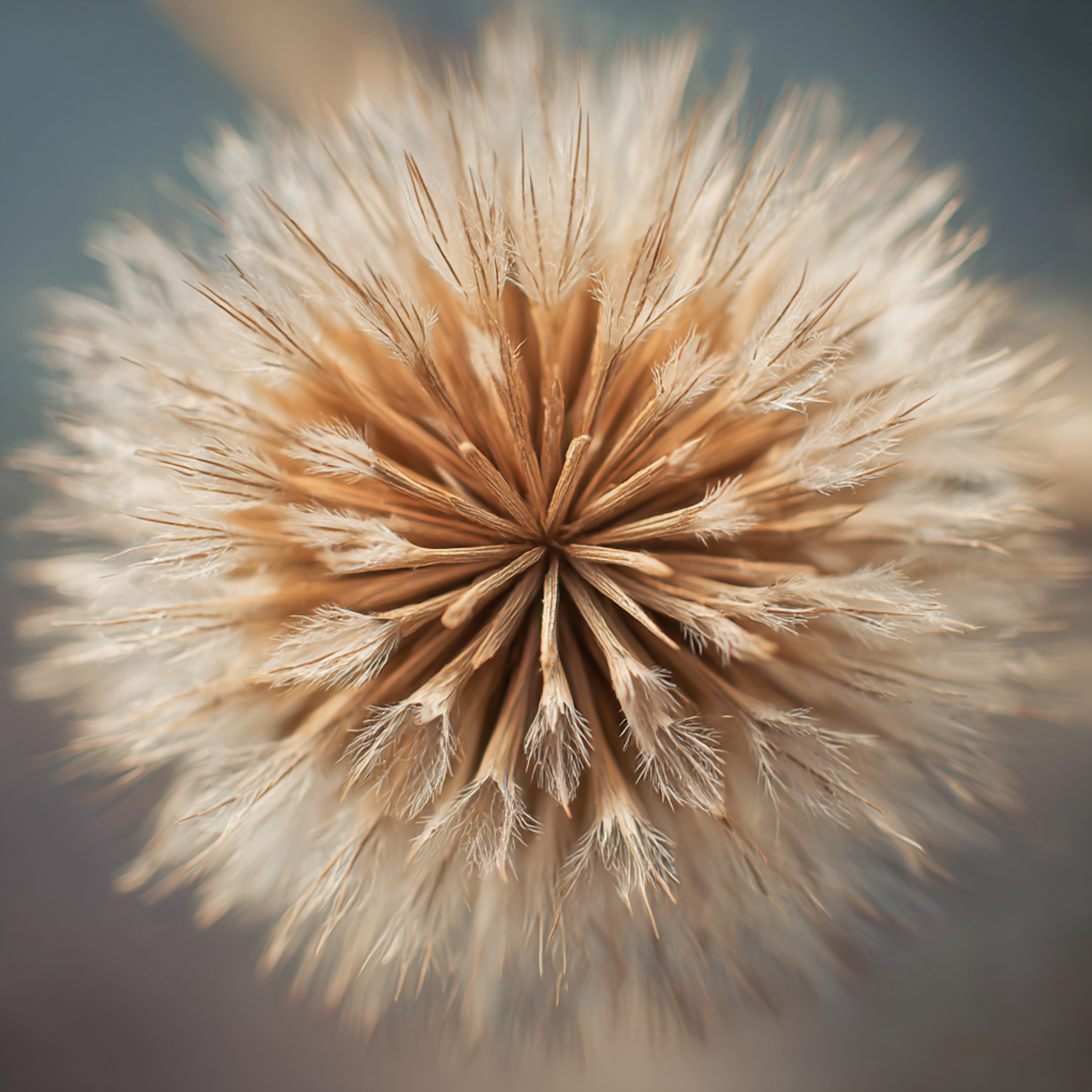Close-up of a dried dandelion seed head, highlighting its intricate structure and delicate textures against a softly blurred background.