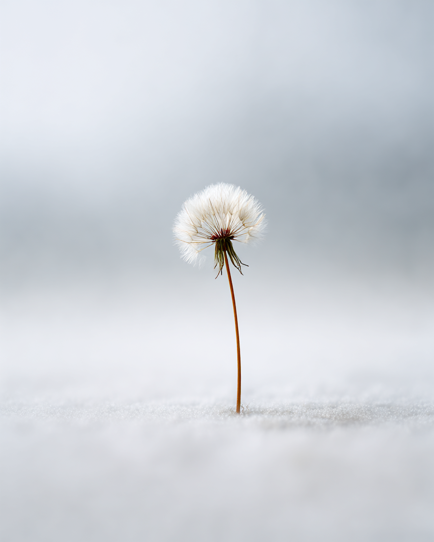 A single dandelion seed head stands on a frosted surface, its delicate white seeds contrasting against a soft gray background.