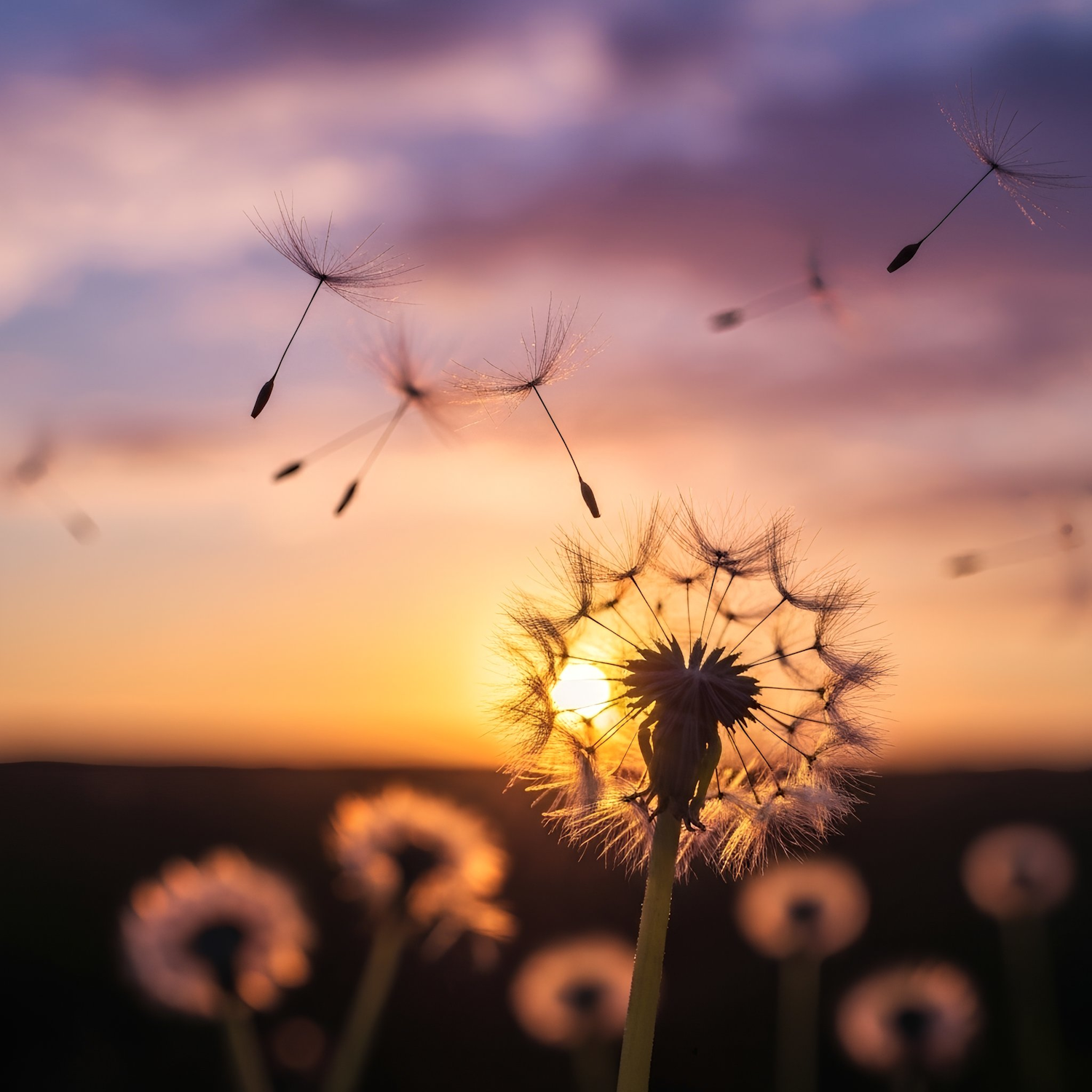 Dandelion seeds drifting in the wind against a vibrant sunset sky, creating a peaceful and dreamy atmosphere.
