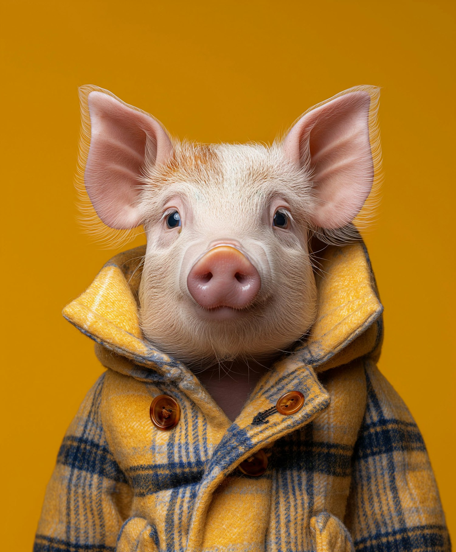 Adorable piglet in a yellow plaid coat against a vibrant yellow background, showcasing a playful and charming scene.