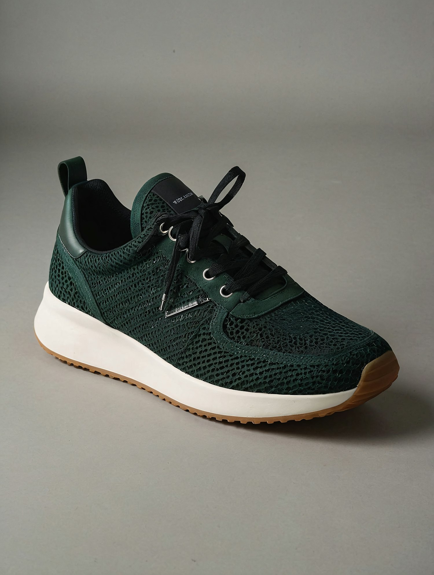 Dark green textured sneaker with black laces, white midsole, and gum outsole. Perfect for casual or semi-casual looks.