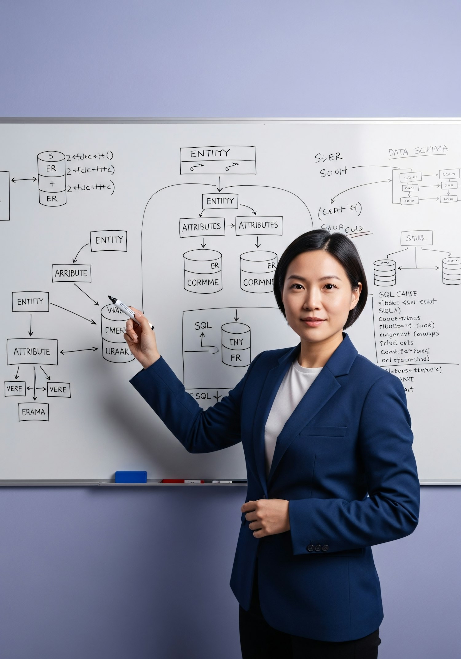 A professional woman explains database concepts on a whiteboard, showcasing technical expertise in a modern educational setting.