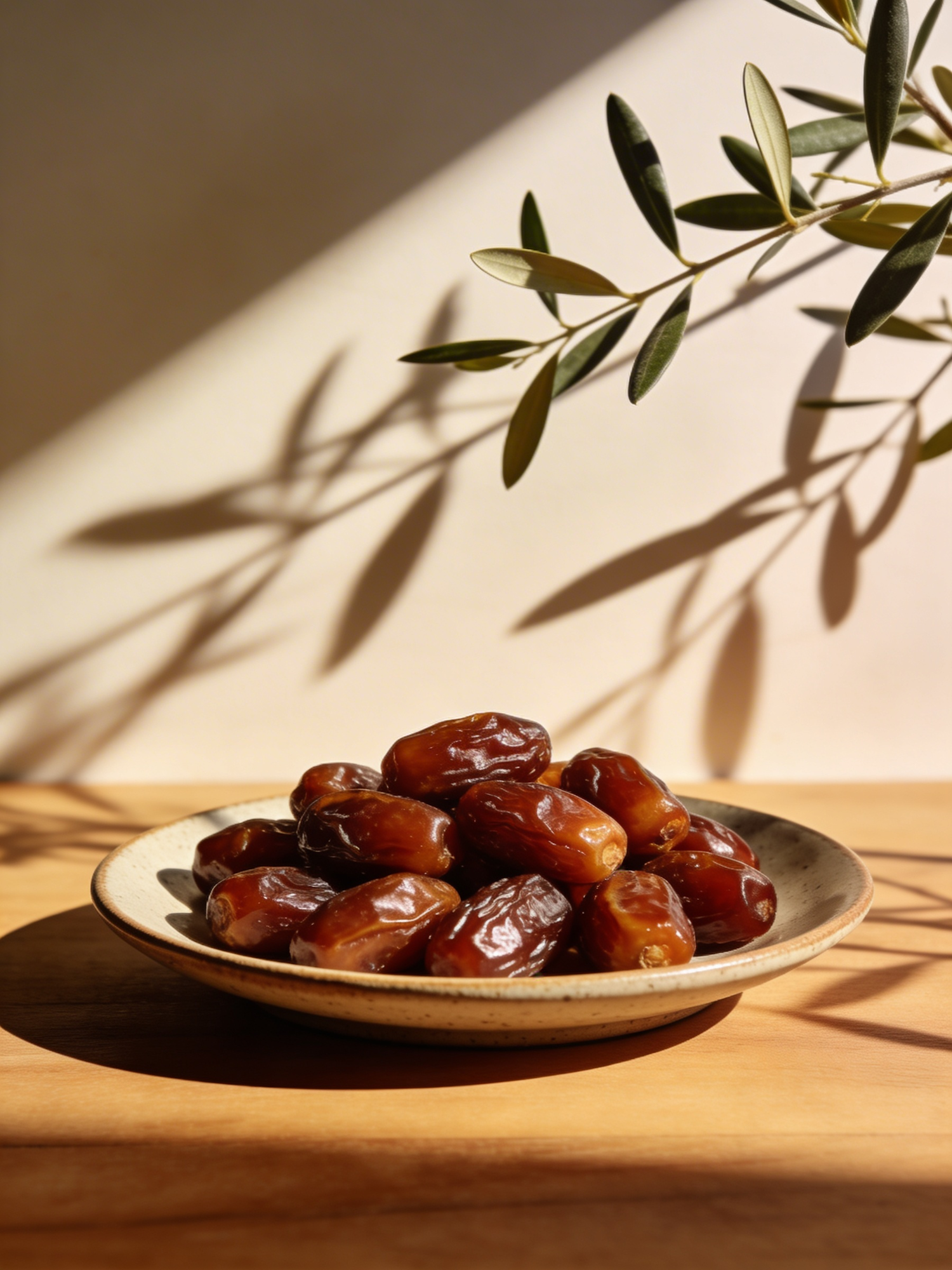 A high‑definition editorial Ramadan composition. A shallow ceramic plate of glossy dates sits on a wooden surface, with dramatic shadows of olive branches cast across the background. Warm directional light creates depth and a peaceful, contemplative atmosphere. Minimal, clean, no text, no logos.