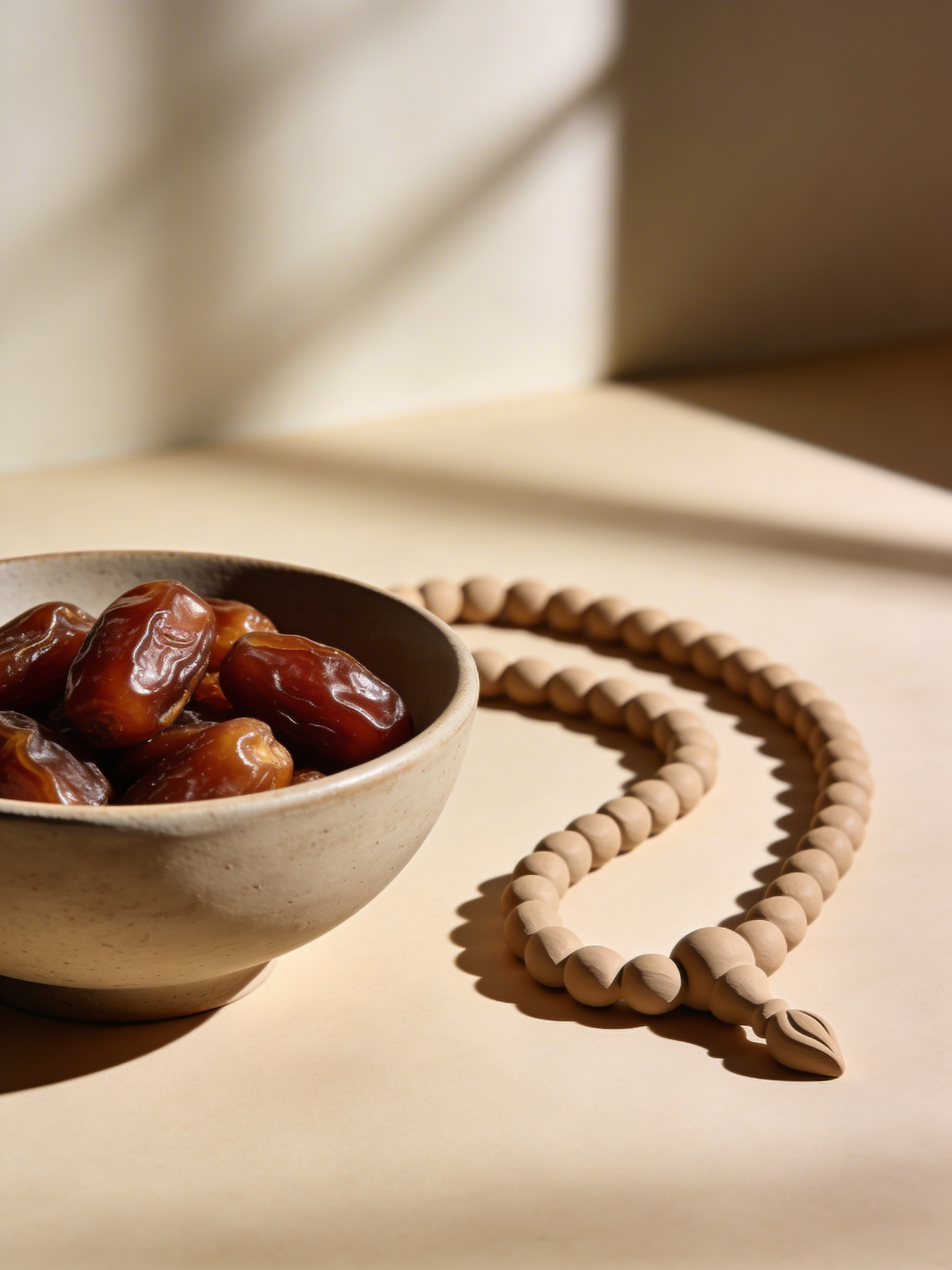 A high‑definition minimalist Ramadan still life. A matte ceramic bowl filled with glossy dates sits on a soft beige surface beside a sculptural looped tasbih arranged with intentional curves. Warm natural light creates gentle shadows, giving the scene a calm, gallery‑like presence. Clean composition, neutral tones, no text, no logos.