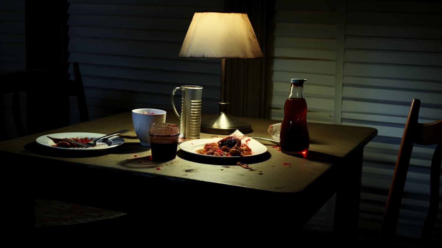 Cozy dining table with a warm lamp, partially eaten meal, and red drink, creating an intimate evening ambiance.
