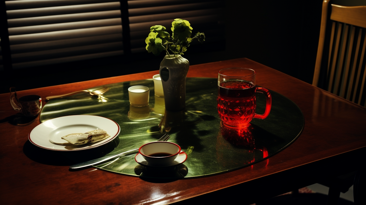 Cozy dining table setup with red drink, white plate, and green flowers in dim lighting.