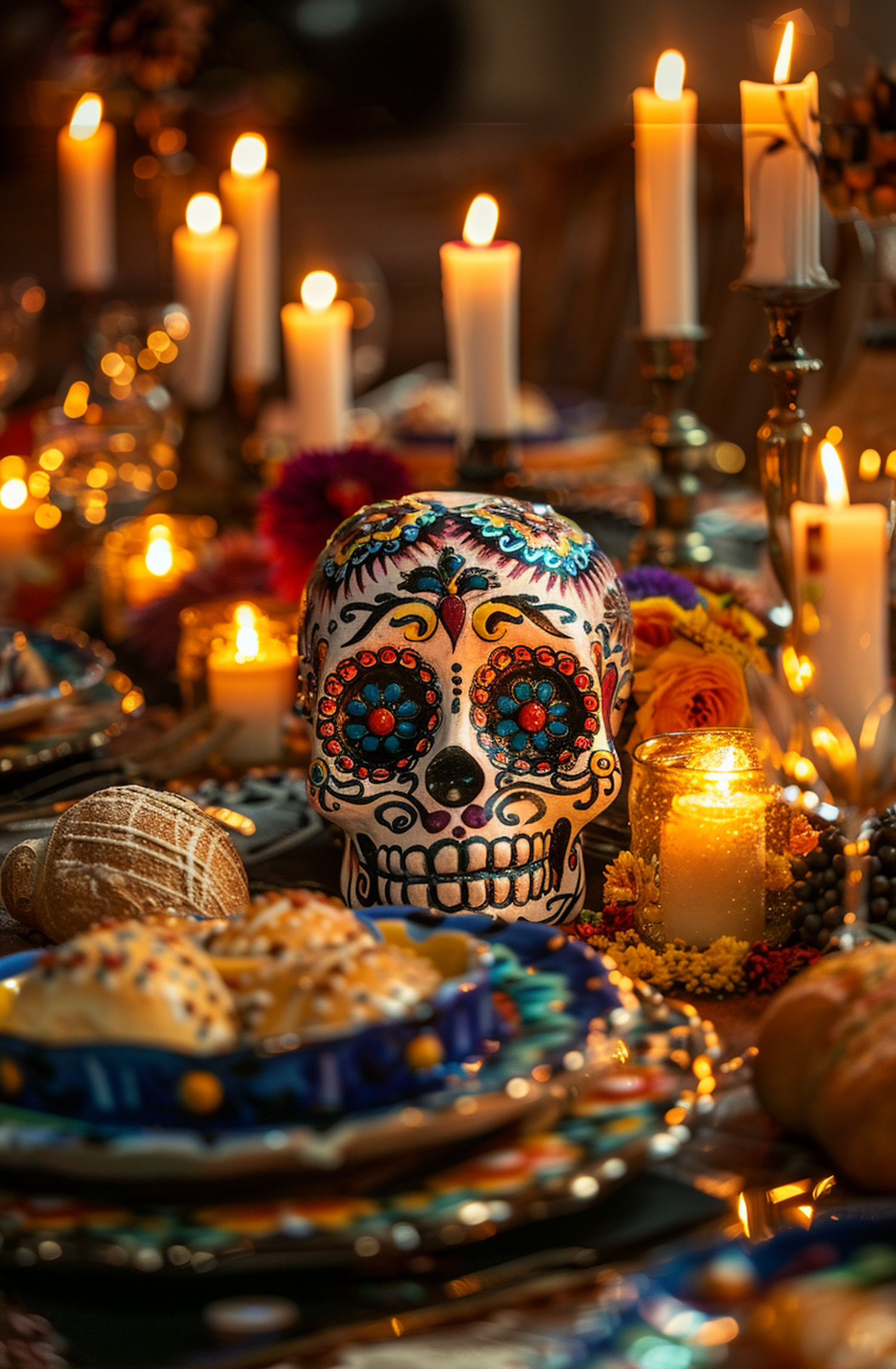 Colorful sugar skull and candles on a festive table, celebrating Day of the Dead with vibrant decorations and traditional pastries.