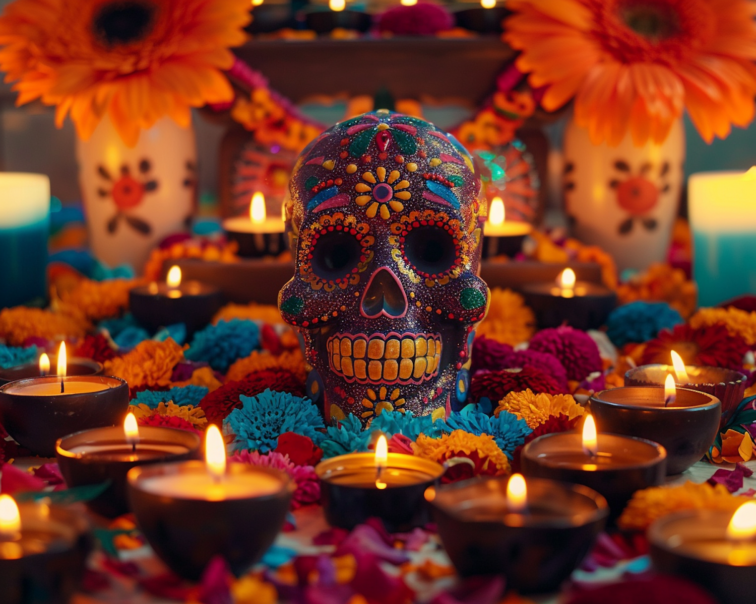 Colorful Day of the Dead altar with a decorated sugar skull, lit candles, and vibrant marigold flowers, creating a festive atmosphere.