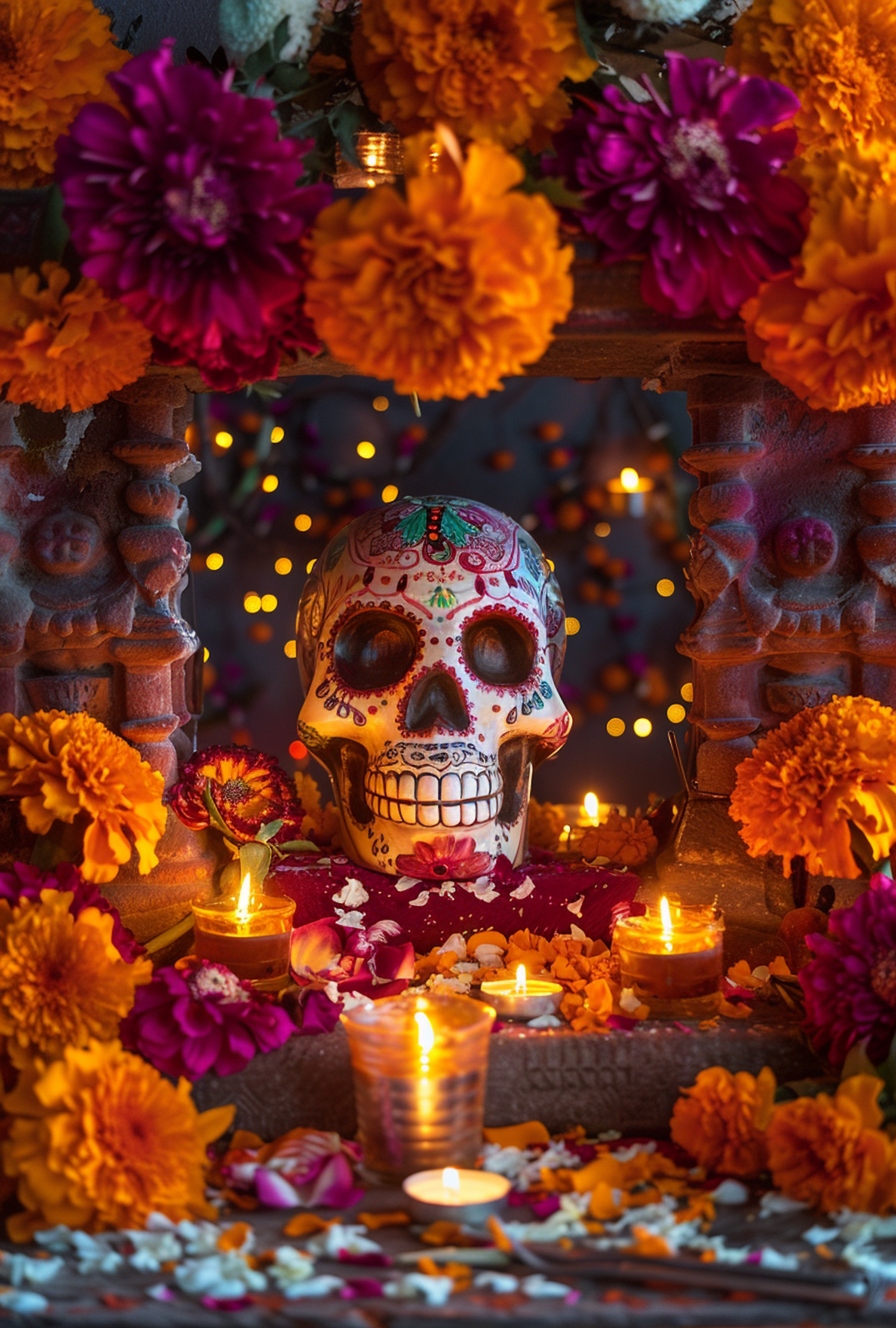 Colorful Dia de los Muertos altar with a decorated sugar skull, marigolds, and candles, creating a vibrant and festive atmosphere.