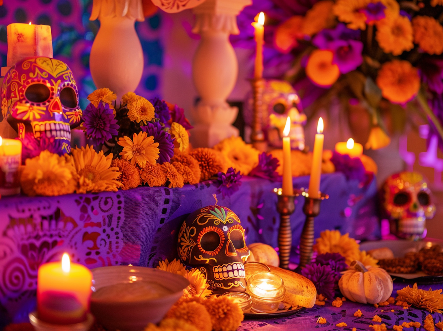 Colorful Day of the Dead altar with sugar skulls, marigolds, and candles, creating a vibrant and spiritual atmosphere.