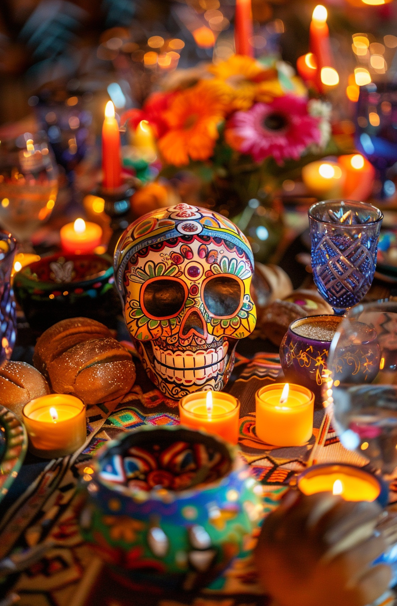 Colorful Day of the Dead altar with a painted sugar skull, candles, and flowers, capturing the vibrant essence of the celebration.