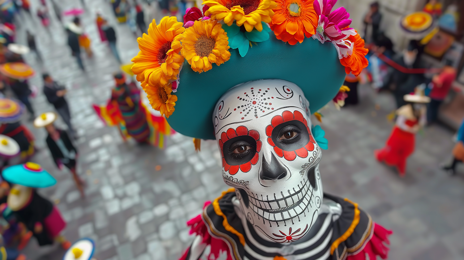 Vibrant Day of the Dead celebration with a person in sugar skull makeup and a flower-adorned hat amidst a colorful parade.