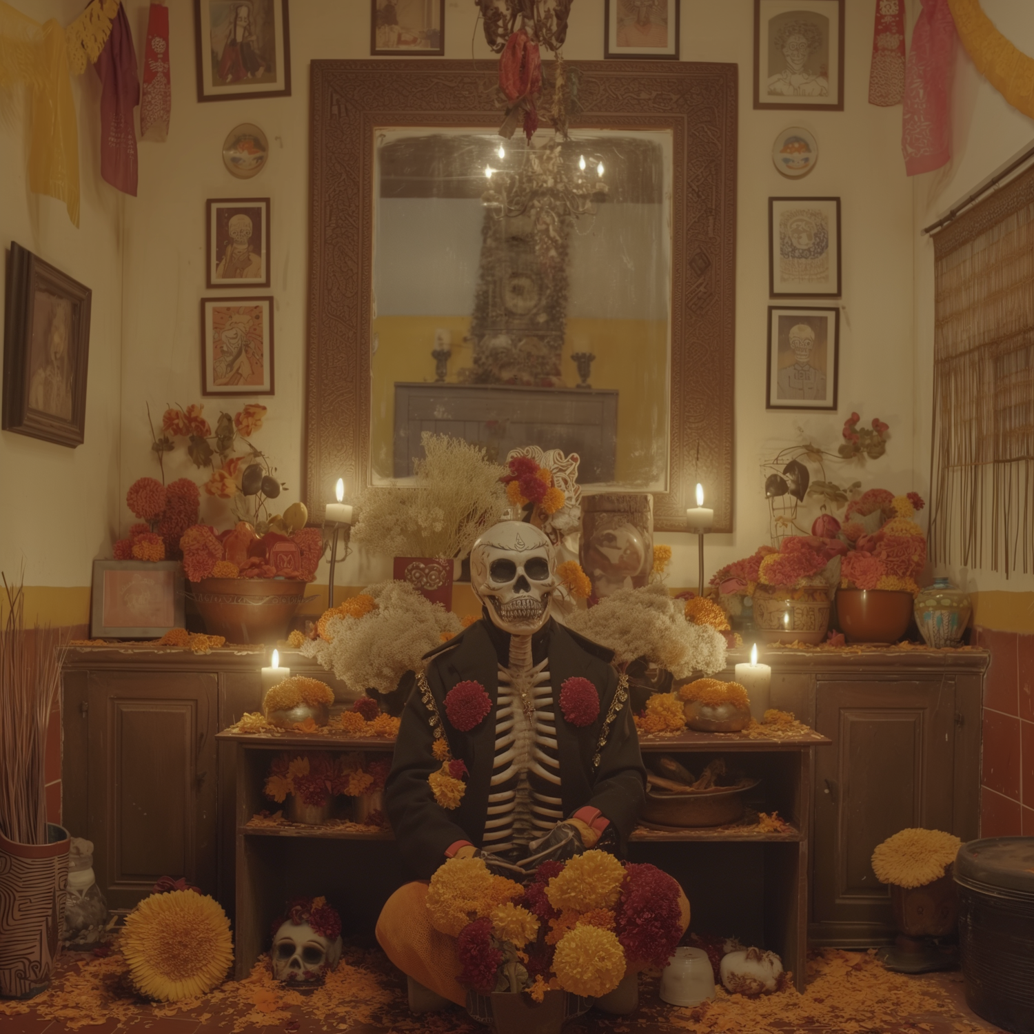 A skeleton-costumed figure sits amid marigolds and candles in a festive, solemn Day of the Dead altar setting.