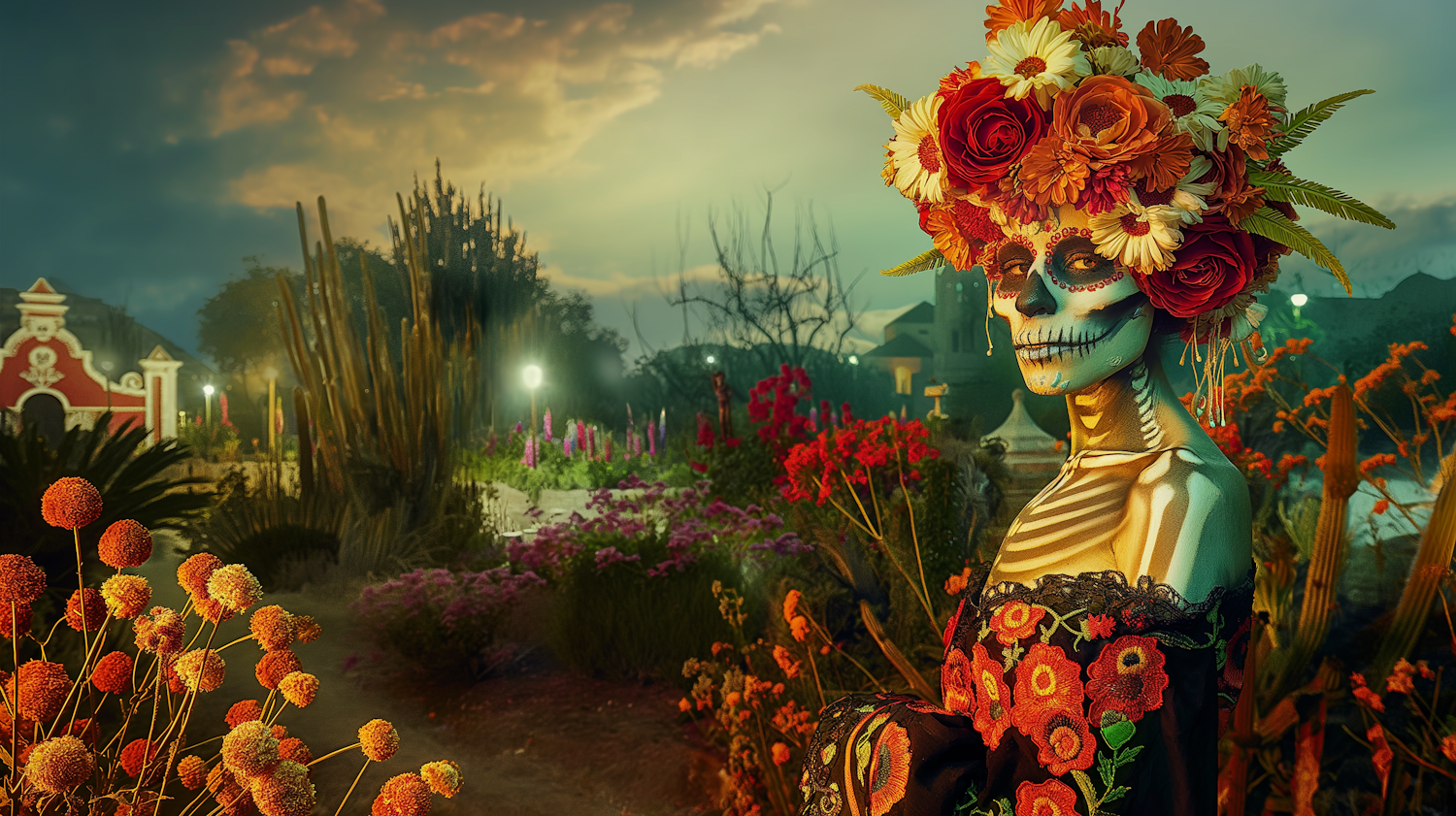 A woman with a painted skull face and flower crown stands in a vibrant garden at dusk, surrounded by colorful flowers and a red building.