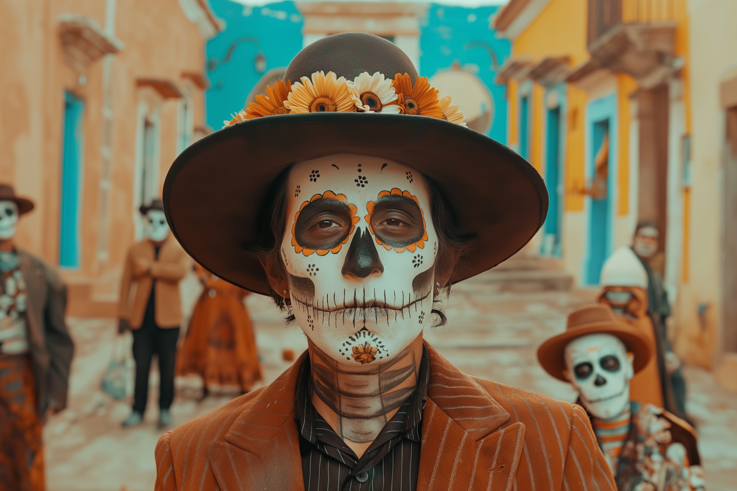 Colorful festival scene with costumed figures, vibrant flowers, and traditional skull face paint, set against a lively street backdrop.