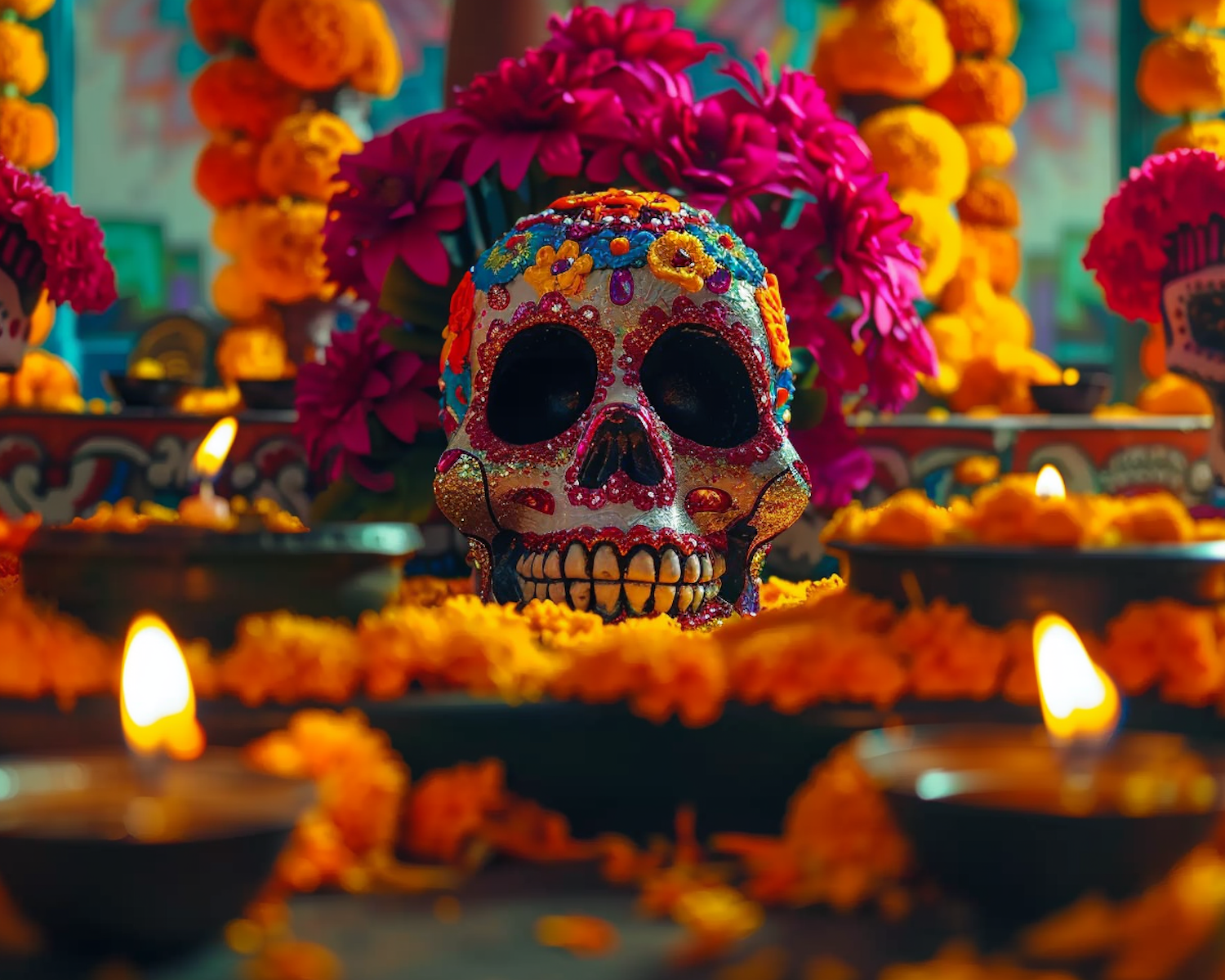 Colorful sugar skull surrounded by marigolds and candles, capturing the essence of Day of the Dead celebrations.