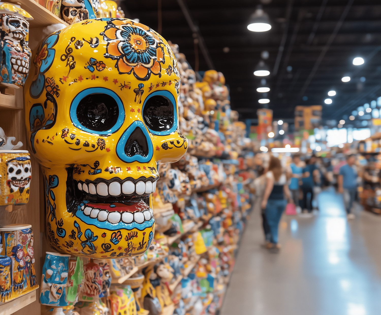 Colorful ceramic skull with floral designs in a lively store setting, surrounded by vibrant pottery and bustling shoppers.