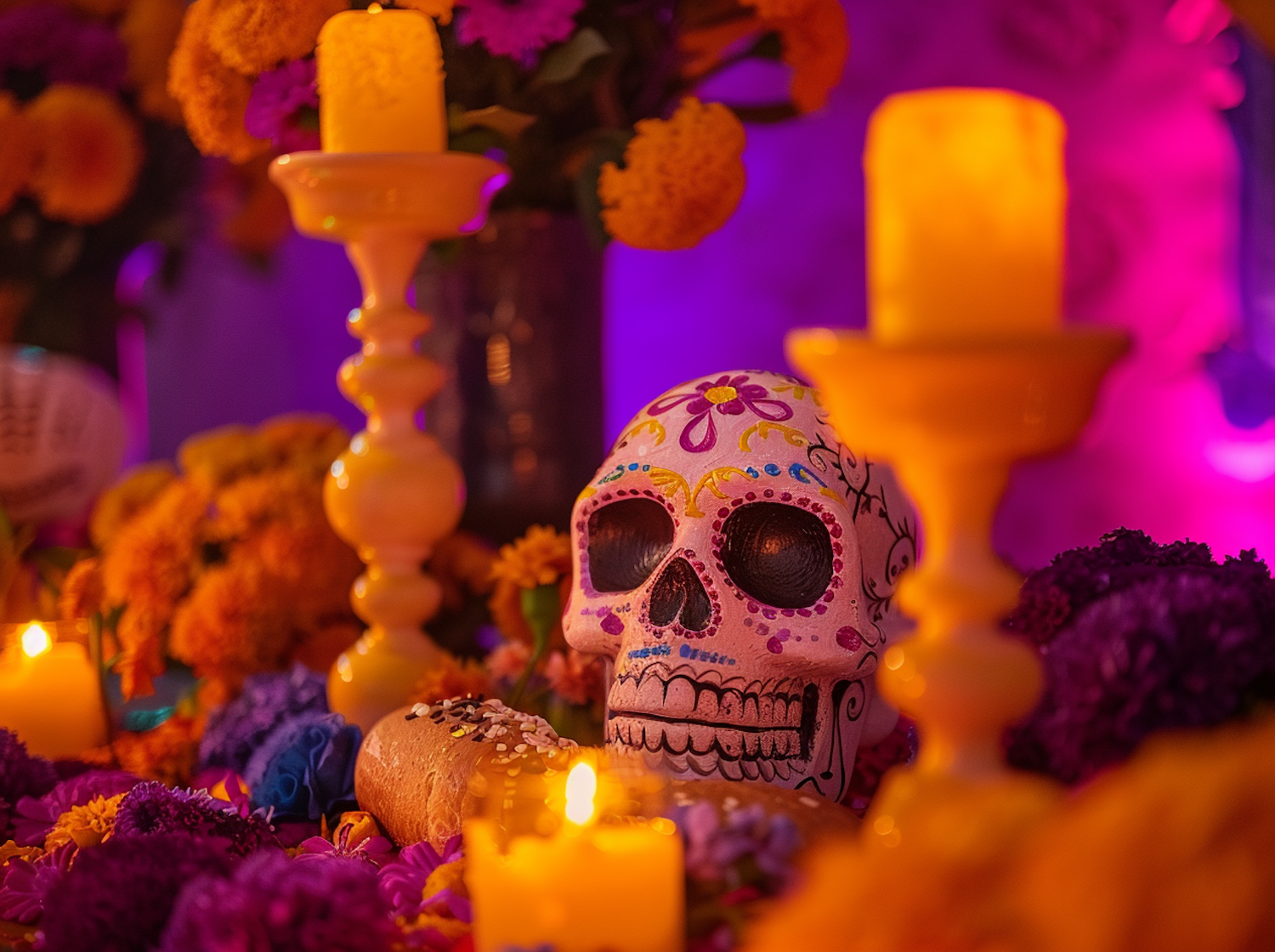 Colorful Day of the Dead altar with a decorated sugar skull, marigolds, and glowing candles, creating a festive atmosphere.