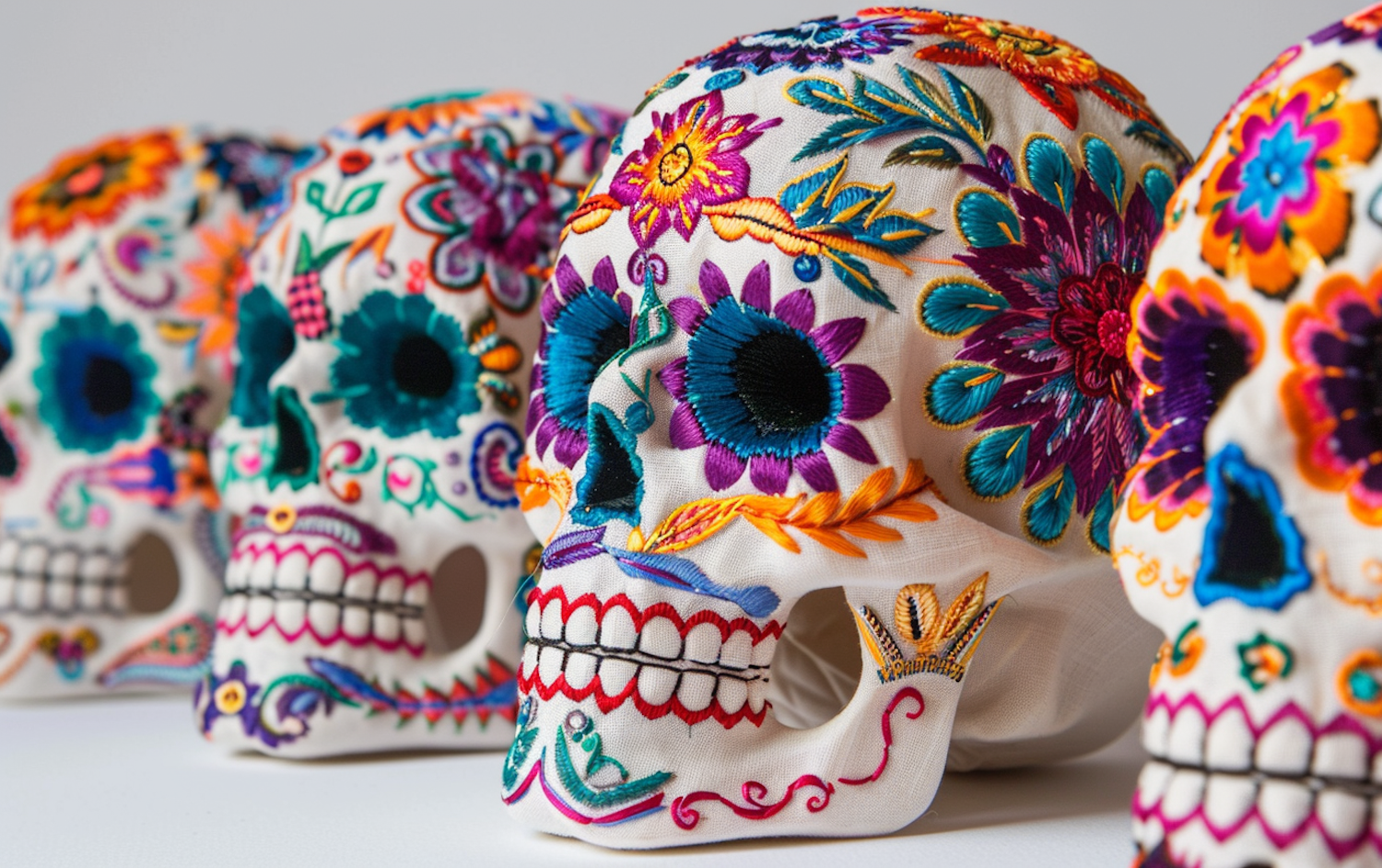 Vibrant embroidered skulls with colorful floral patterns, showcasing intricate designs and cultural artistry.